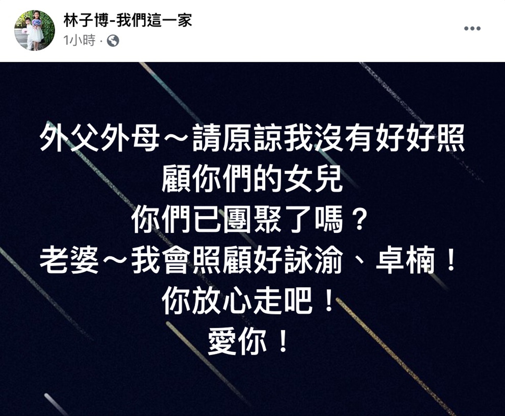 今早林子博在社交平台寫下情深說話,表示太太已與離開人世。「外父外母,請原諒我沒有好好照顧你的女兒,你們已團聚了嗎?老婆,我會照顧好詠渝、卓楠,你放心走吧,愛你!」不少網民留言盼他堅強振作,好好照顧兩個女兒。