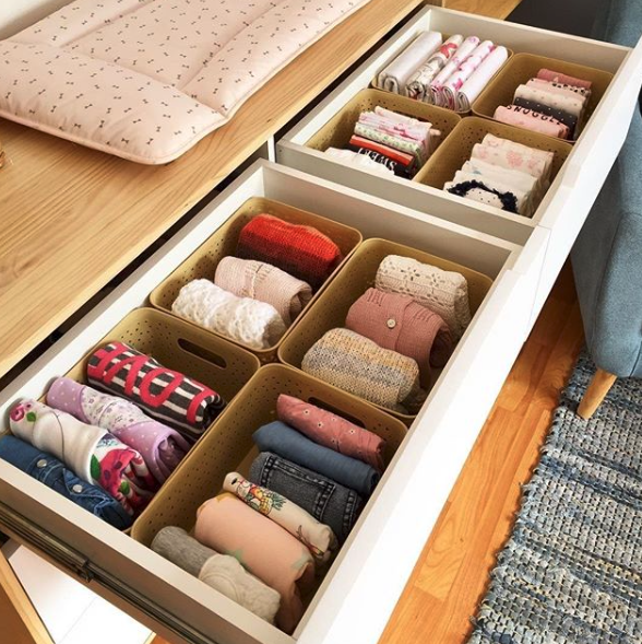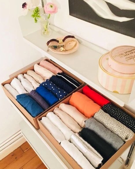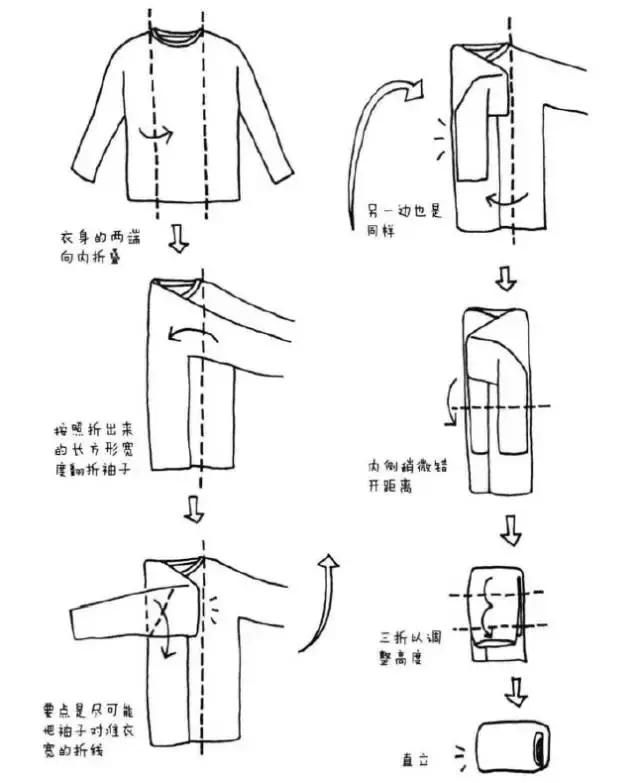 而近藤麻理惠對收納衣服很有一套,她平時都會用「豆腐磚摺衫法」來收納衣物,這樣做除了能讓衣服整齊排好外,還能節省衣櫃一半的空間,而這個方法也能應用在行李上,大家去旅行就不用怕行李位不夠了!