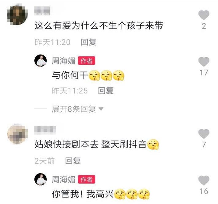 周海媚是圈中有名的黃金剩女,但是面對單身的生活絲毫不寂寞,事關喜歡寵物的她有5隻愛犬陪伴,日前為了幫其中一隻愛犬慶生,特別為它拍短片慶祝,殊不知引來網民留言:「這麼有愛,為什麼不生個孩子來帶?」周海媚也不是省油的燈,即刻霸氣回應:「與你何干」更加上一個挖鼻孔的表情符號,叫該網民「先活好自己吧!」此話一出獲不少網民大讚真性情!