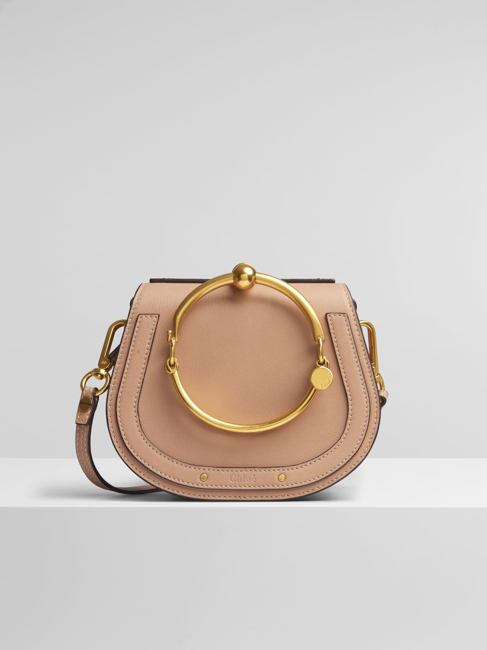 經典Chloé袋款加上大圓金屬圈,可以側背或直接拿著金屬圈,拿在手上辦識度很高,加上裸粉色很百搭,早春用來配搭碎花裙一流!