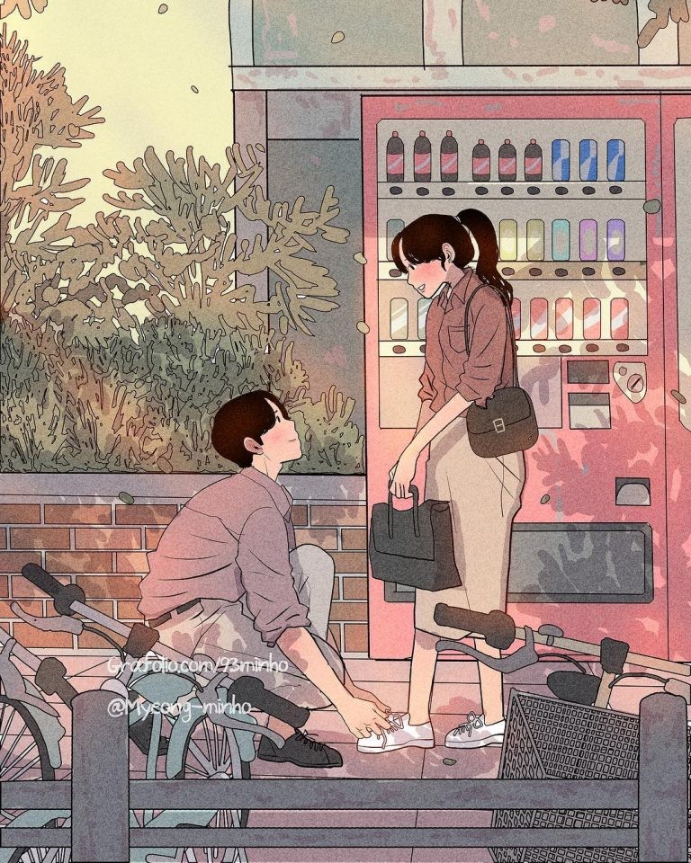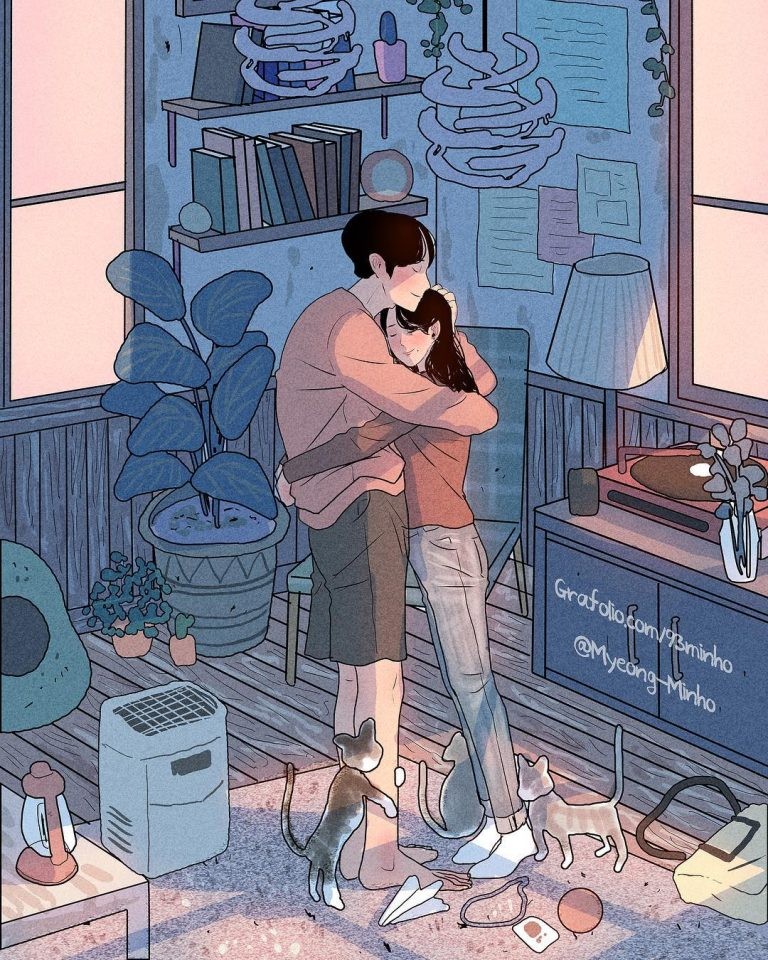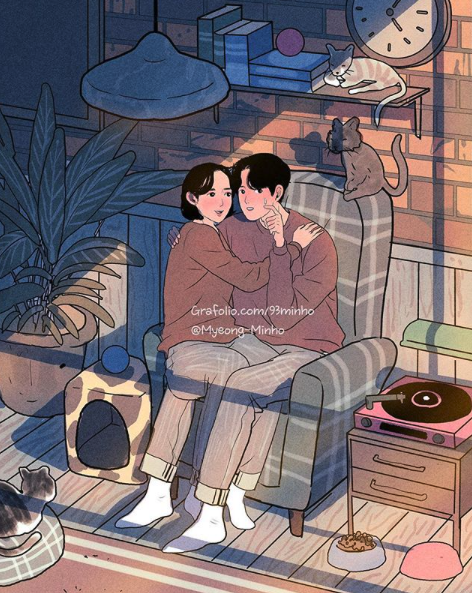 人與人之間嘅相處,永遠都係一門學不完的學問。每對愛侶都有屬於佢哋自己嘅相處模式,但講到幸福甜蜜,有一個愛情保鮮法雖然係最簡單,卻教人最易忘記—陪伴。陪伴固然需要一個雙方都覺得舒服嘅空間,但更需要嘅係情感上嘅支援,放下手機、工作,用最簡單、最直接、最原始嘅對話溝通,將雙方拉近。一個美好嘅二世界,若然少了最真摯嘅陪伴,哪會幸福?韓國插畫家명민호(Myeong-Minho)筆下嘅作品,描述愛侶間生活日常,寧靜的一刻,身邊有你陪伴著,就係最簡單但幸福的日子。