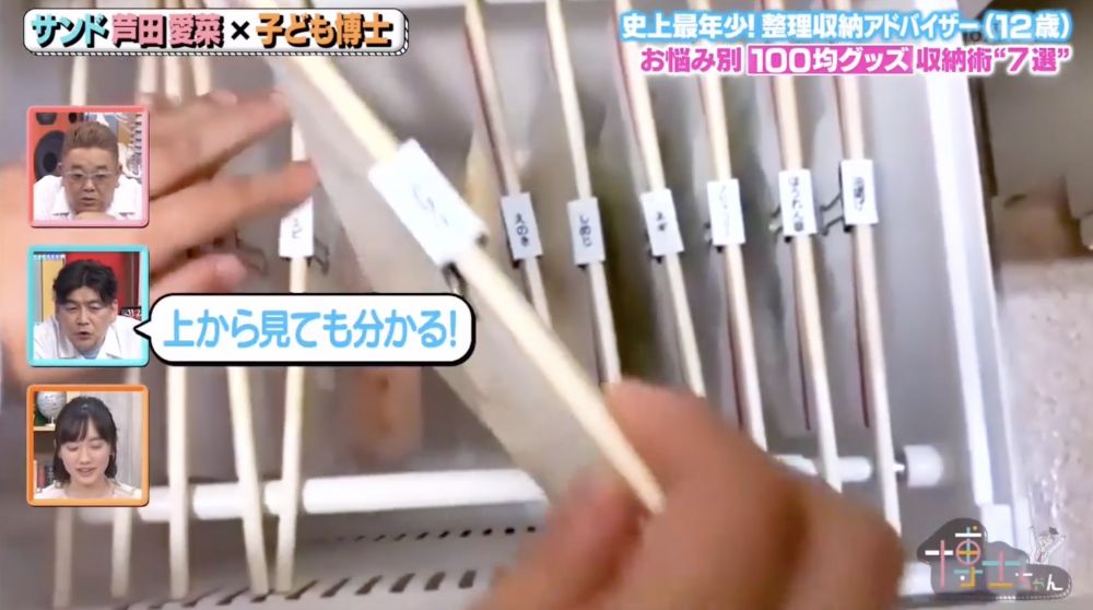 清水麻帆教大家可使用即棄筷子、長尾夾和伸縮棒,重新調動食材擺放位置。首先,將即棄筷子捲在保鮮袋的頂部,用長尾夾夾緊,貼上食材標籤,再以直立形式晾在伸縮棒上,從頂端俯視一目了然。打開雪櫃時更容易看清所剩食材外,防止食材囤積和過期。