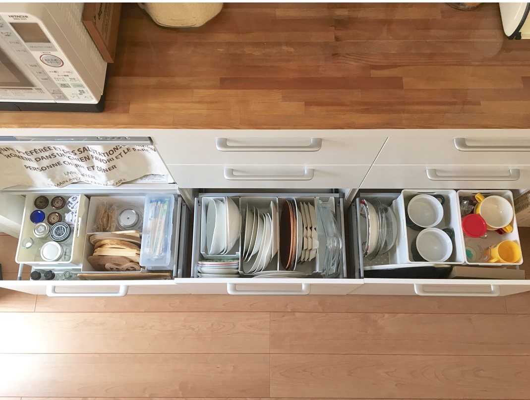 廚櫃太大,餐具、碗碟、杯子、玻璃盒卻一大堆,想放得整齊易找,可以用不同大小的小膠箱,分門別類地放好。日本主婦喜歡儲起玻璃瓶備用,方便以後放醃漬食品。