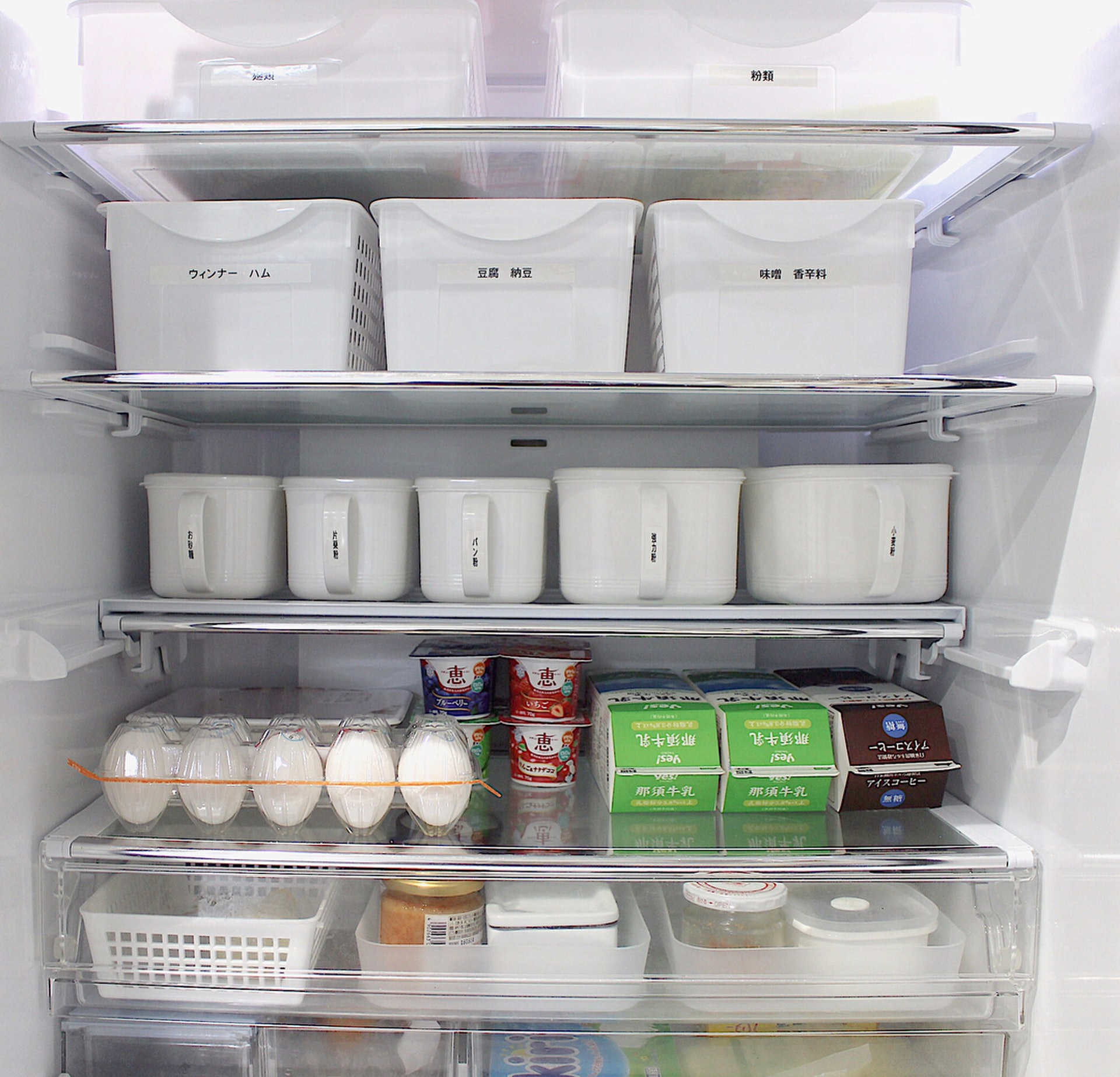 日本主婦喜歡用白色收納盒整理,不論是放在雪櫃還是客廳都非常整齊,而且看起來簡潔有品味,不過記得如果放在雪櫃要貼上label,便可清晰看到雪櫃裡有甚麼食材可用。