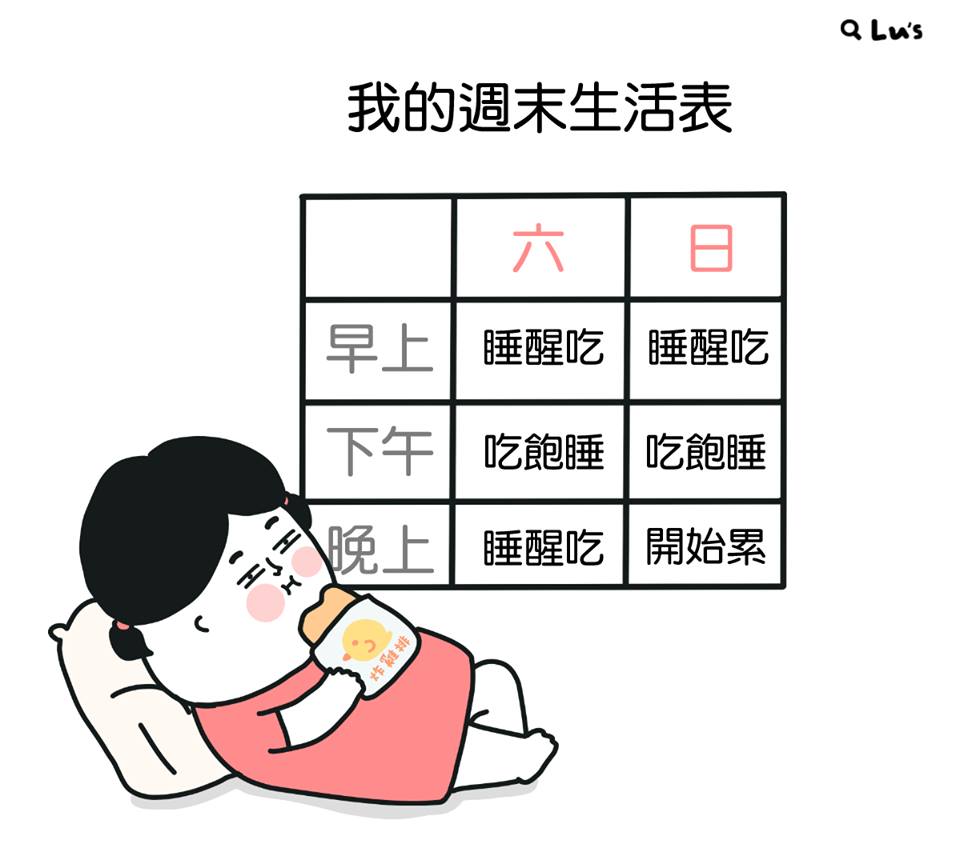 #10 「我的週末生活表:早上睡醒吃、下午吃飽睡、晚上睡醒吃,星期日的晚上開始累。」