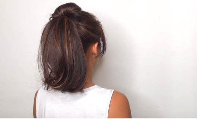 跟平日紮馬尾方式一樣,先紮好一條中馬尾,拎出馬尾最上層嘅頭髮,噴上少量定型用品。