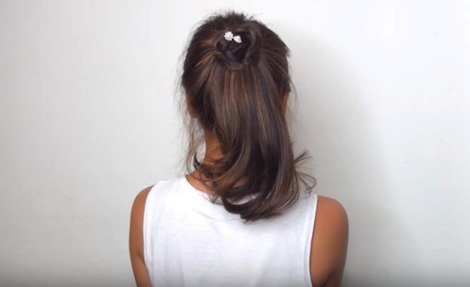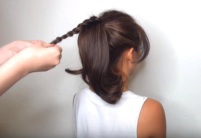 先紮一條馬尾,再抽出其中小部份頭髮紮一條幼幼嘅鬢辮。