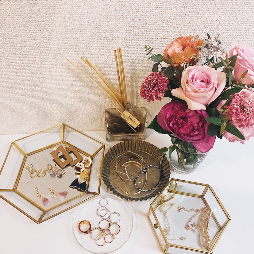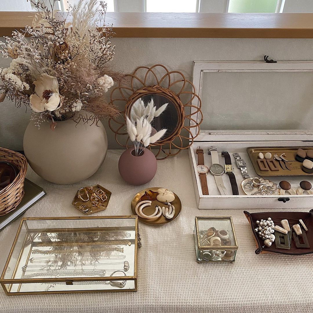 如果要讓你的化妝檯看起來很有質感,其實只需要用玻璃罐或是陶瓷的器皿,就能讓你的飾品閃閃發亮。想讓自己的梳妝檯更有品味,可以精心挑選適合飾品的碟子,如帶有復古感的陶瓷器皿,耳環則可以放置在透明玻璃碗中,不只放置好看,互相印襯之下還能點綴單品,使整體看起來更為亮眼。