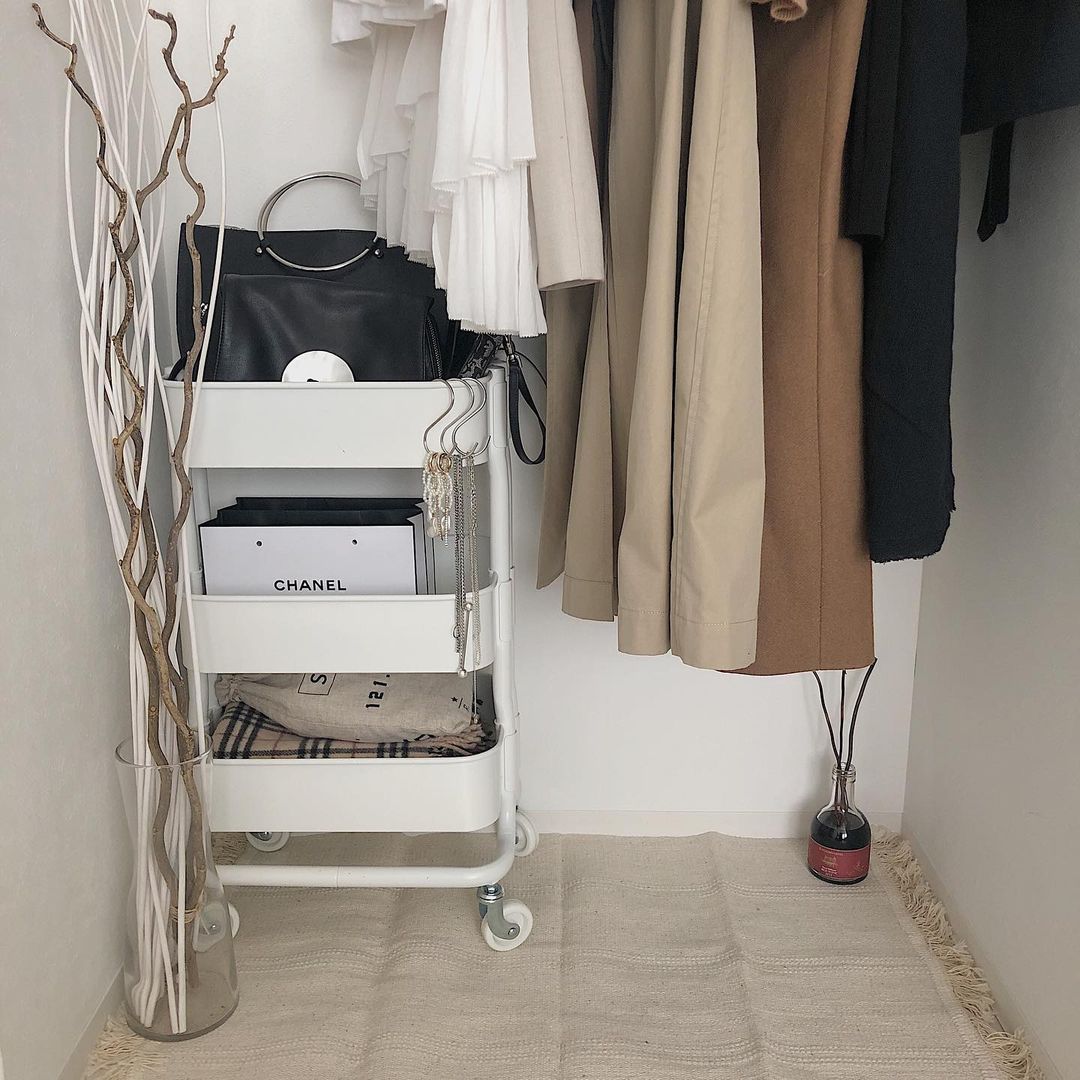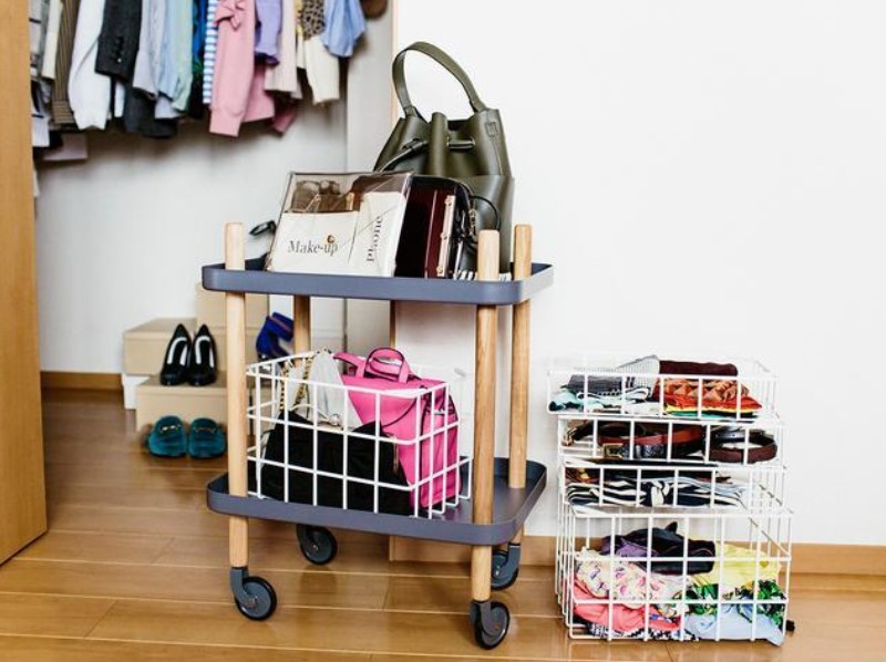 雜物太多會令房間看起來很狹窄,可以買一部小型的推車,放置手袋、皮帶等日常小物,不用到的時候推到房間角落,既可以推動又能方便索取。