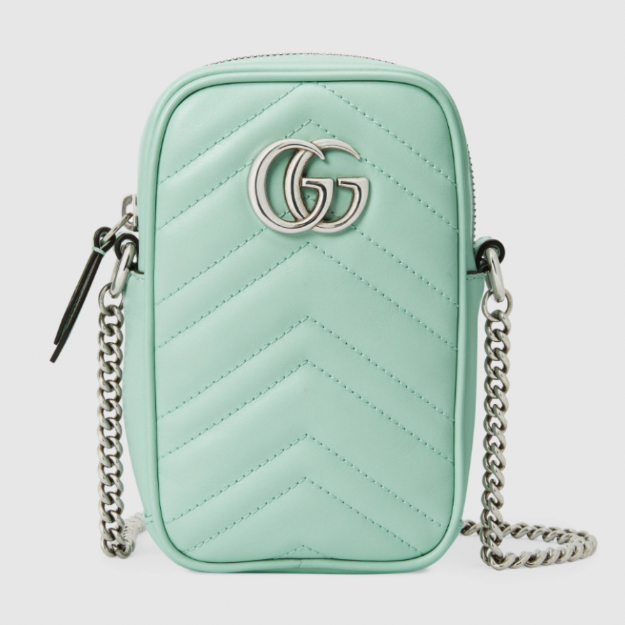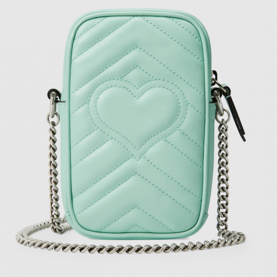 最適合預算一萬左右的女生,長方型設計的「相機包」,容量不算小,綴有金色雙G配件及背面心型車紋,再加上薄可綠的配色,給人清新活力之感。