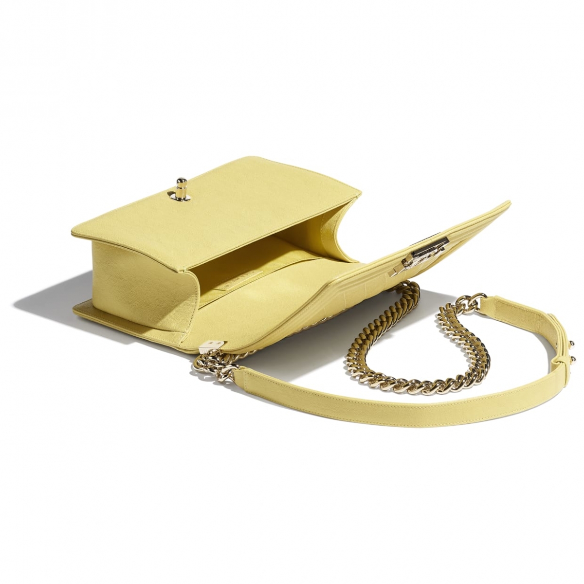 長方型的袋身、線條乾淨俐落,配上粗鍊條,突顯出中性魅力,換上淺黃的糖果色,亦不失少女感,是一剛柔並重的袋款。