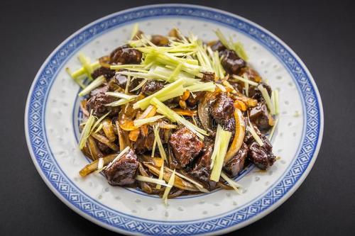 3/ 燒熱油鍋,加入薑和牛肉快燒至半熟,再加入韭葱炒至顏色變翠綠,即成。
