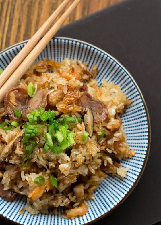 3.準備好材料後,先在飯煲爆香蒜蓉,臘腸粒及蝦乾粒。