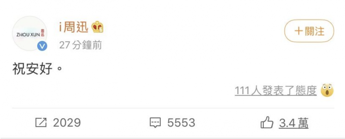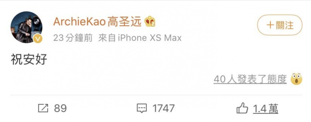 就在這張激吻照傳出後不久,周迅和高聖遠就選擇在微博上間接承認了早已經離婚的事實。周迅和高聖遠中午在微博上同時發聲,寫下「祝安好」三個字,等於官方承認了雙方已經離婚的傳聞,為這段六年的婚姻畫下句號。
