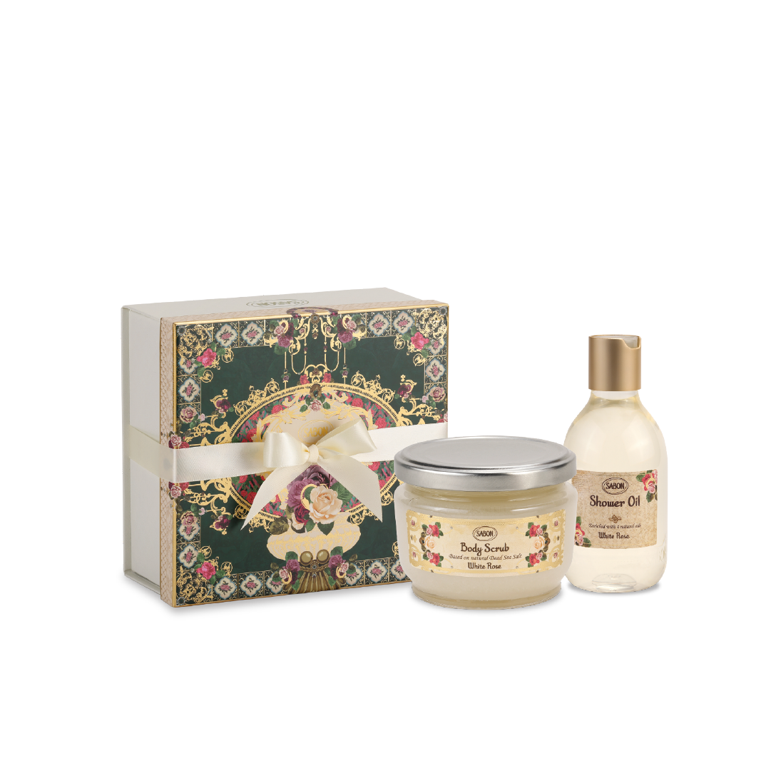 禮盒內集合兩件皇牌必備身體護理產品,沐浴油及身體磨砂,能潔淨同時呵護全身嬌嫩的肌膚,並散發著純白玫瑰細膩動人的芳香。