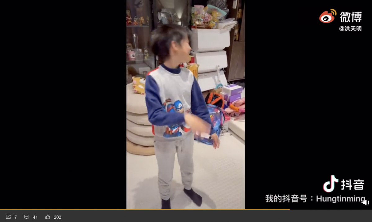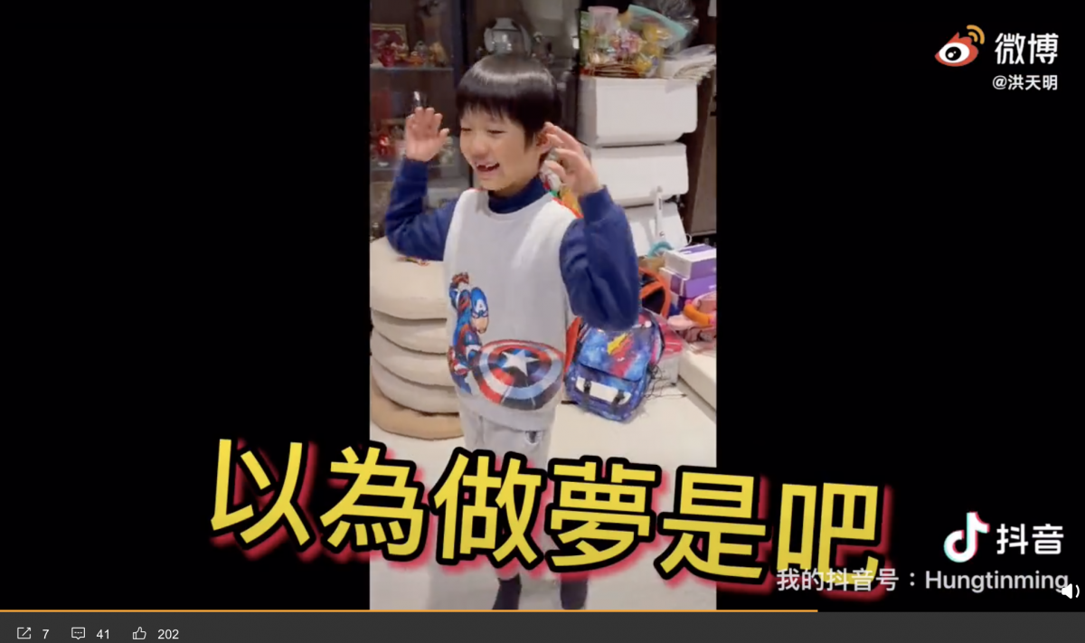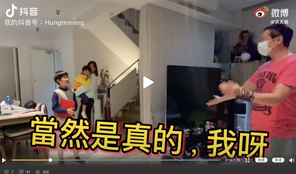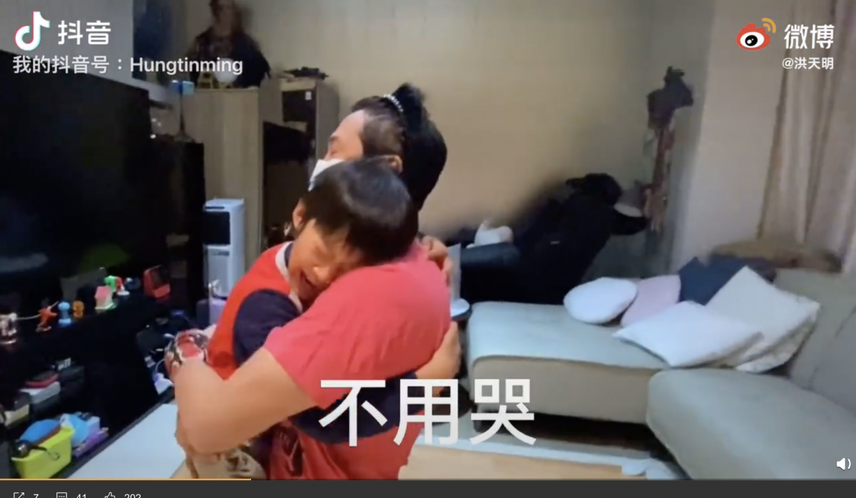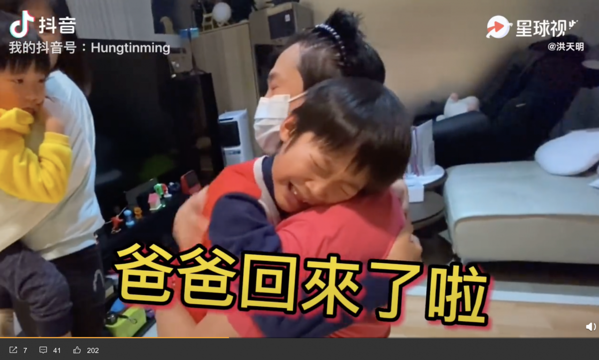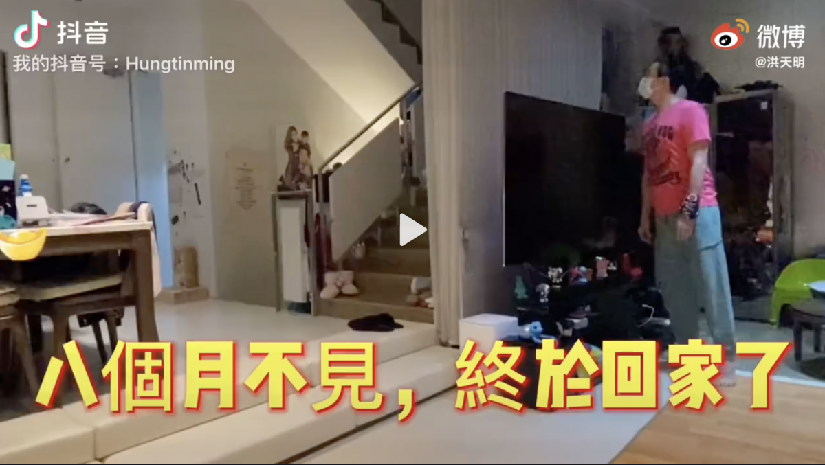 洪天明在微博的片段上表示「八個月不見了,終於能回家啦。孩子在不知道的情況下會有什麼反應⋯⋯希望大家能多陪家人。疫情快點離去。」
