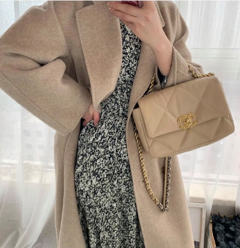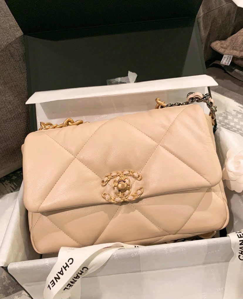 Chanel 19是老佛爺生前設計的最後一個Chanel袋款,整體外型貫徹了Chanel的高雅格調,搭配特大的菱格紋與金屬鍊條。有別於基本的黑色,這款奶茶色為這個經典款賦予新的元素,實在令人難以抗拒!