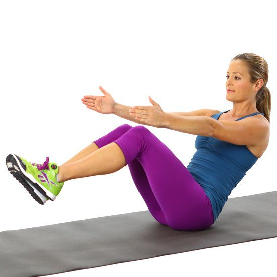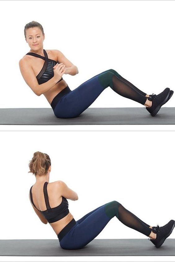 首先坐在瑜伽墊上,雙腿曲膝,雙腳著地,上半身與大腿之間呈一個V字型,雙臂伸直並握住雙手,帶動身體往左右兩邊擺,記住一定要繃緊你的腰腹部,做幾下就能感受腰兩側的拉伸感。左右為一下,做20下,休息15秒,再做20下,做3次。