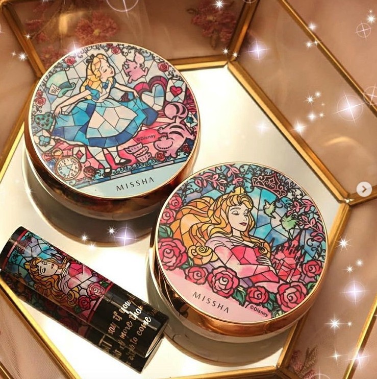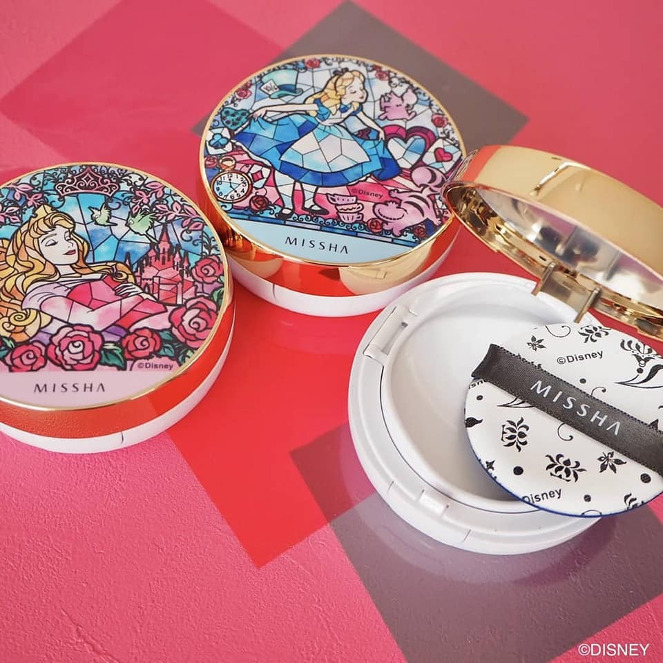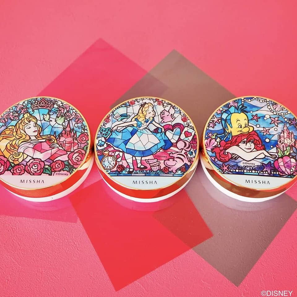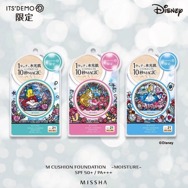 今次Missha氣墊粉底(Magic Cushion Moisture SPF50+/PA+++)換上了三個迪士尼公主的全新包裝:睡公主、愛麗絲、小魚仙,除了氣墊盒上印有華麗的彩繪玻璃圖案,連內裏的粉撲也印有美美的花紋,設計非常有心思!