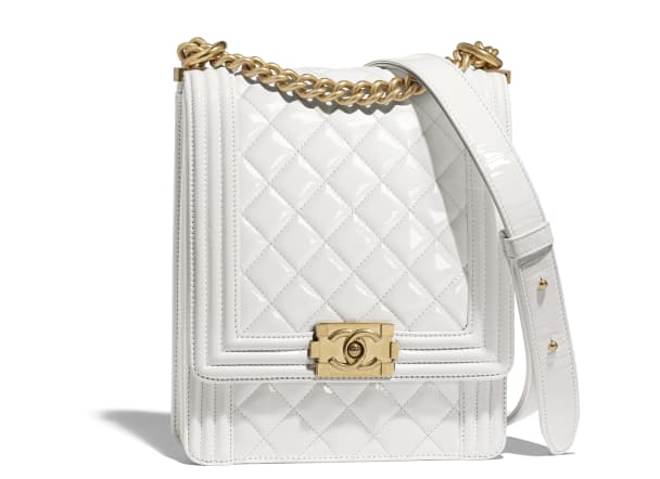 BOY CHANEL的變形版是Chanel近年的新作,保留了BOY CHANL圍邊的坑紋和金色大Logo牌子,把手袋的高度拉長,帶出另一番的感覺,也使手袋的容納量增加,金色牌子肩鏈和白色漆皮相輔相成,太美了!