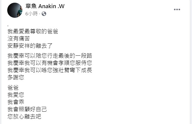 今晨約2時,黃榮璋撰文向父親道別:「你放心離去吧。」並公佈父親死訊,享年77歲。黃榮璋寫道:「我慶幸可以陪您行走最後的一段路,我慶幸我可以有機會孝順您服侍您,我慶幸我可以喺您強壯臂彎下成長,多謝您。爸爸,我愛您,我會乖,我會照顧好自己,您放心離去吧。」