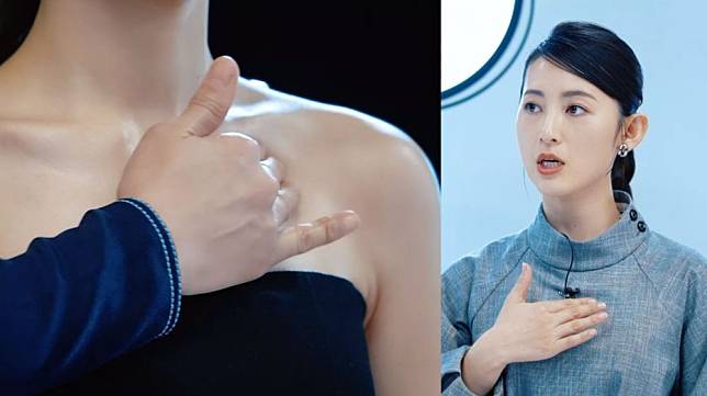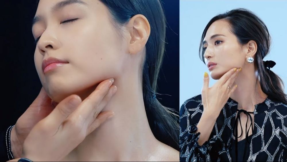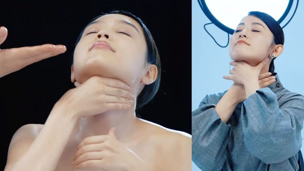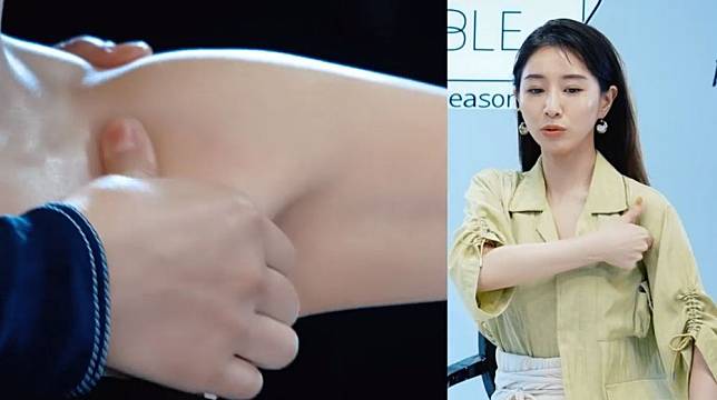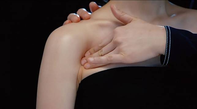 用3隻手指置於腋下並稍微捏住,然後用姆指向下按壓,可以大力一點。然後用指腹,從鎖骨下方開始慢慢向後推,再移向腋下位置。接著握起拳頭,用指關節位置按摩,然後使用食指及中指夾住鎖骨由內向外推。在頸部打圈按摩有助改善頸紋,用指腹沿下頜線推拉至耳內側,然後再推到鎖骨,令下巴線條輪廓更突出。