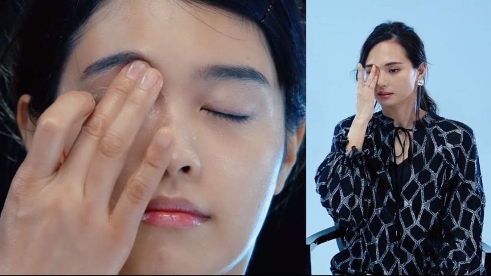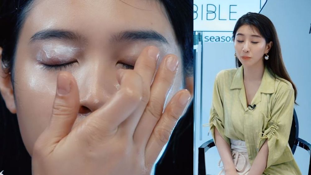 塗抹大量眼霜,防止拉扯眼周皮膚。用中指及無名指由眼下滑向太陽穴,然後用中指指腹,由鼻旁滑向眉下方。接著用手掌貼著臉側,用手腕施力拉提下頜位置,再用手掌貼著臉,用手腕施力拉提法令紋位置約5秒,此動作重覆3至4次。最後,用手捏著耳朵打圈按摩,可以促進血液循環以及拉提效果。