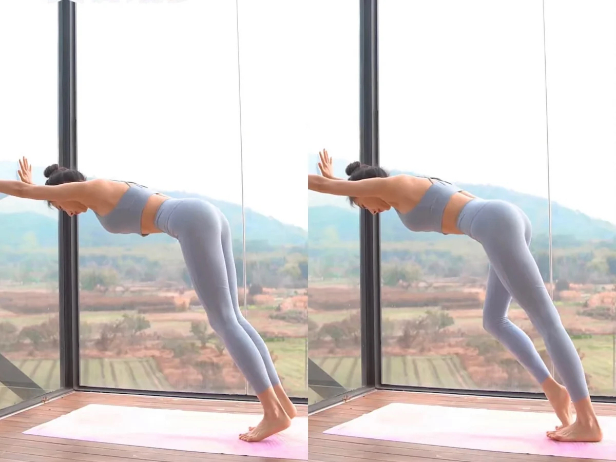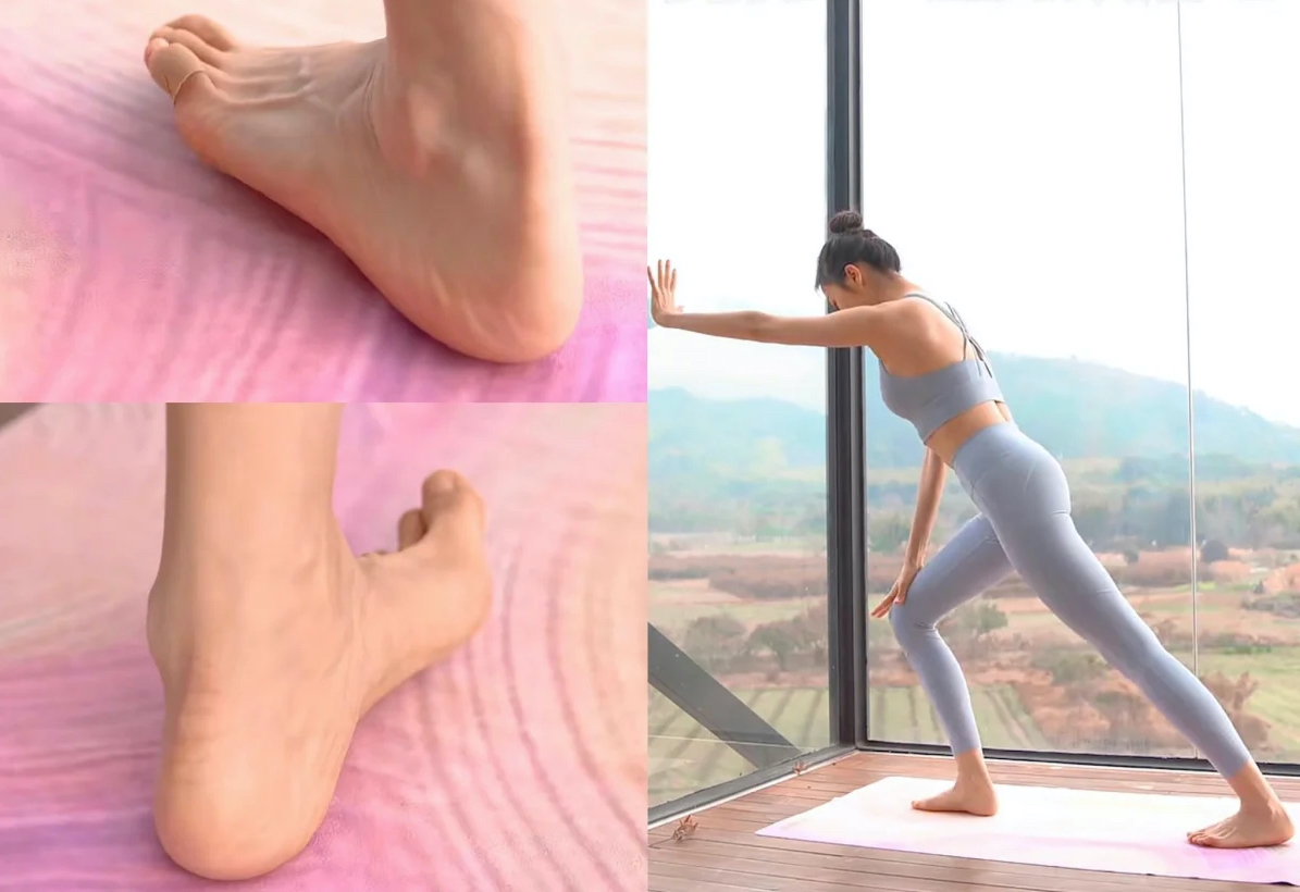 雙手推牆做弓箭步、左腳往後伸腳踭觸碰地面,雙腳腳掌交替將較低往內側和外側翻進行拉伸,1次堅持3秒鐘、雙腿各重複10次。這個動作可以幫助拉伸小腿後側肌肉,明顯改善小腿彎曲問題。