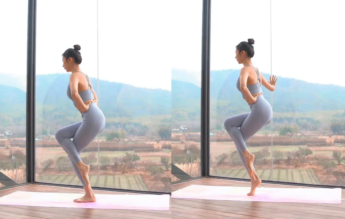 首先挺直身體站立,抬起右腿搭在左腿上慢慢往下屈膝,吸氣時做腿踮起腳尖(初期做時中心容易不穩,可以手扶牆穩定住姿勢)維持5秒鐘、呼氣時回到起始點,做10次後換腿重複動作。這個動作不會造成小腿越練越粗,反而可以很好強化小腿的靜脈泵、收緊深層肌肉緊實小腿圍。