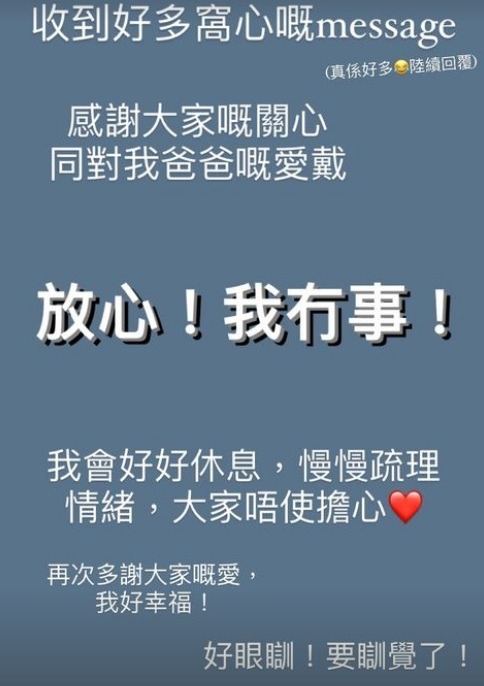 自從智叔傳出病逝消息,兩名兒子未有向外界發表感受,事隔三日,二仔文信在IG限時動態感謝各界的慰問,寫道:「收到好多窩心嘅Message(真係好多,陸續回應)感謝大家嘅關心同對我爸爸嘅愛戴,放心!我冇事!我會好好休息,慢慢疏理情緒,大家唔使擔心,再次多謝大家嘅愛,我好幸福!好眼瞓!要瞓覺了!」
