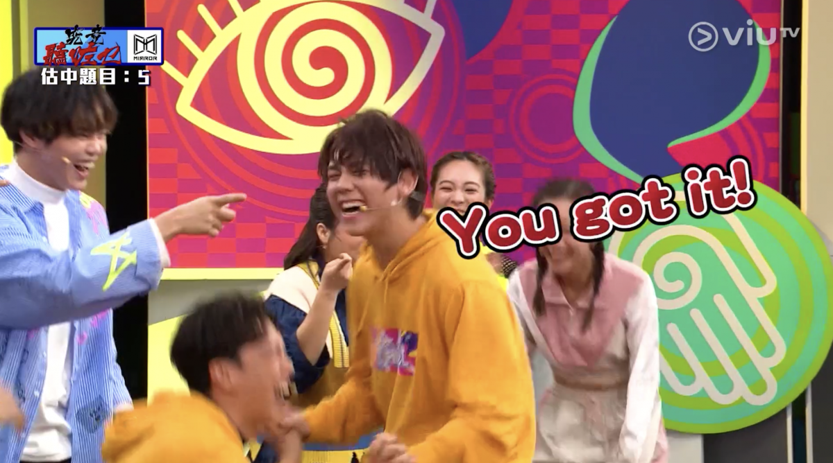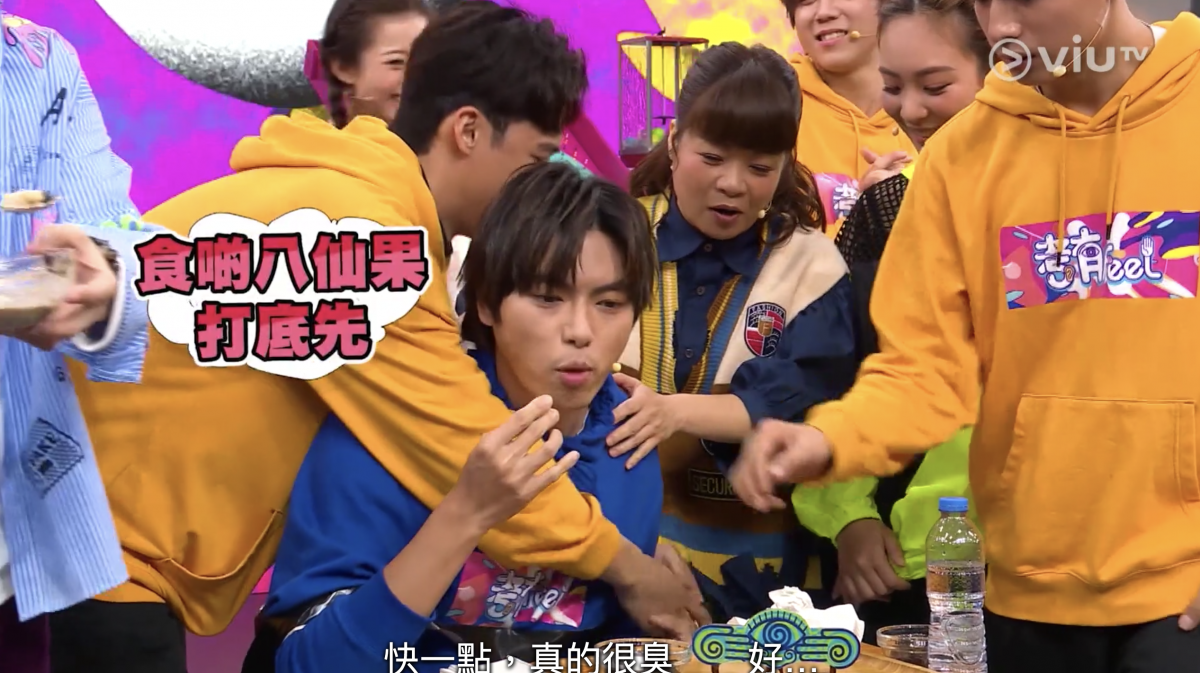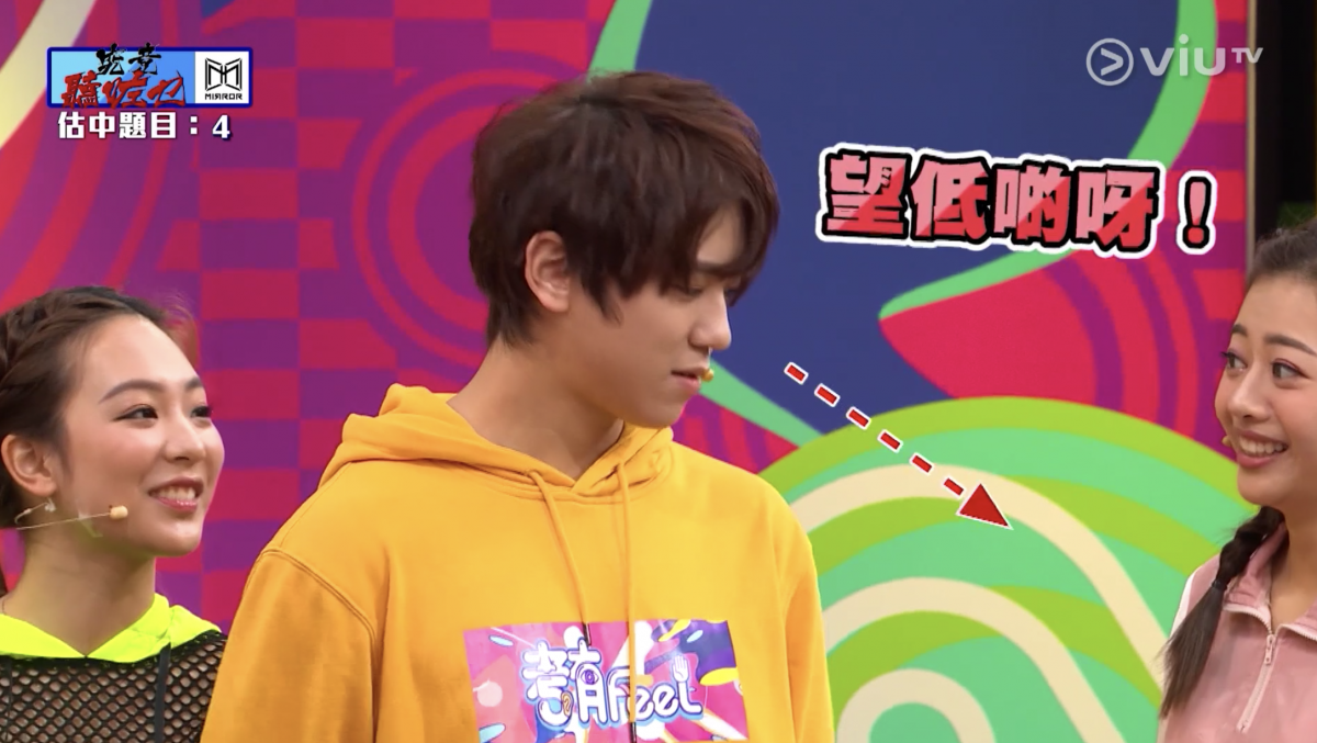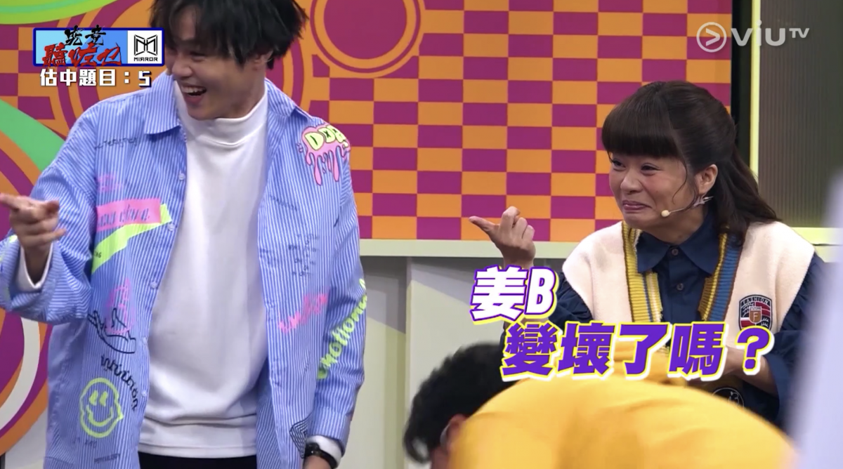 平時彬彬有禮的姜濤,今集就將潛藏的勝負欲大大展露出來,在「究竟聽咗乜」環節中,他要發出聲音,令隊友估「食奶嘴」。姜濤起初嘟嘴扮吃東西,但隊友估不到,他突然向左轉,斜望身旁的「考靚」劉若寶(Polly)胸口,結果令隊友猜中,姜B更開心到狂跳,而主持阮小儀也笑說:「頭先見證姜B成魔之路,佢咁壞係因為呢個遊戲而開始。」