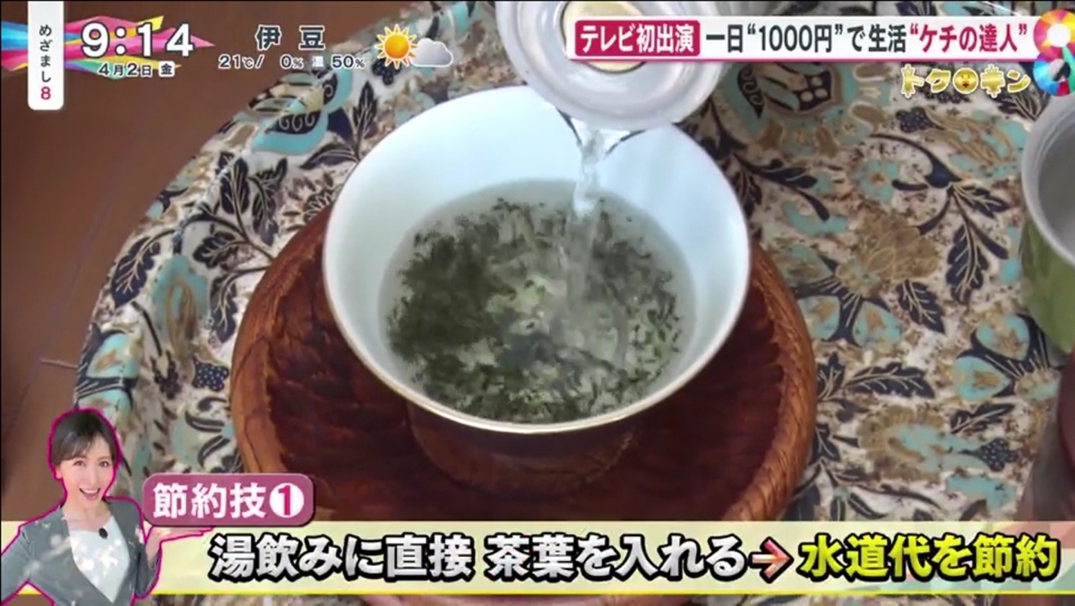 日本人喜歡喝茶,小笠原洋子也不例外。每次泡茶她會直接將茶葉放在茶杯上再添加熱水,而用餐時也會盡量只用一個碗碟,從而節省清洗餐具的水費及洗潔精。