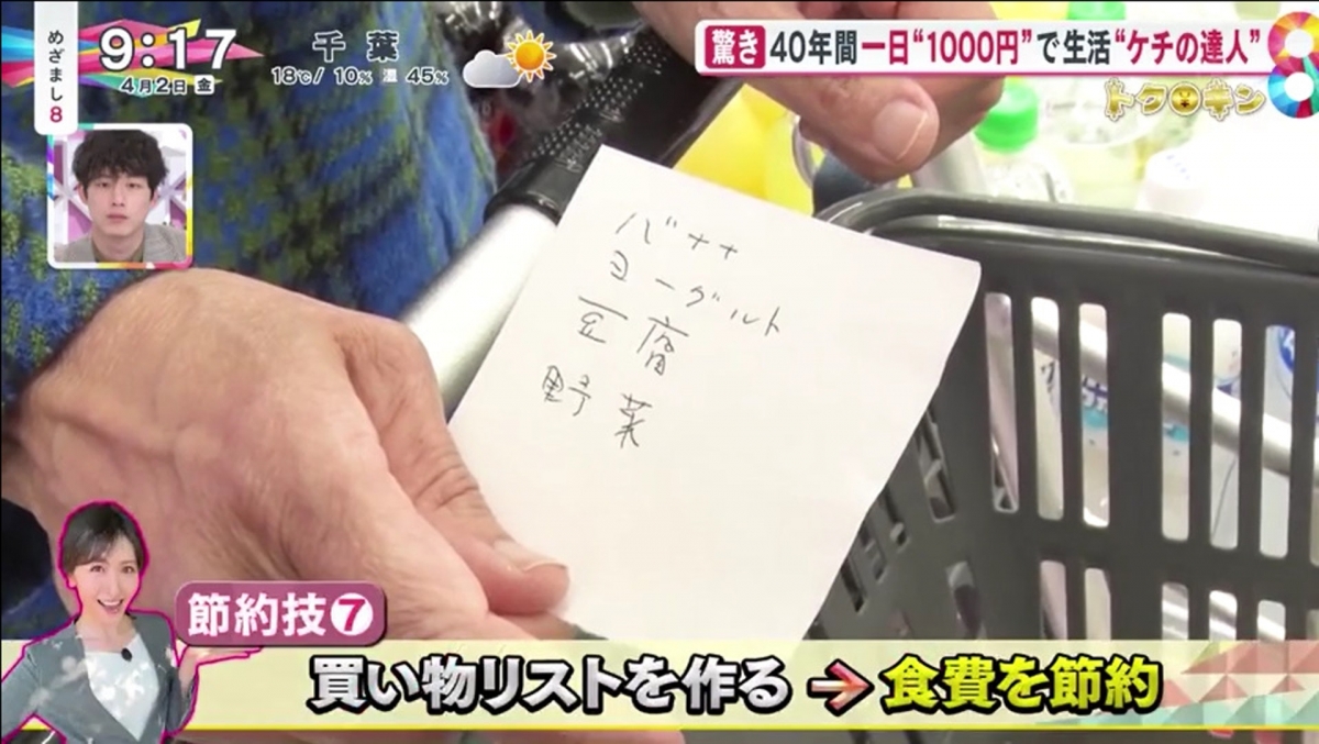 小笠原洋子出門購物前,都會在家事先寫好購物清單,去到超市依據清單只買必需品。