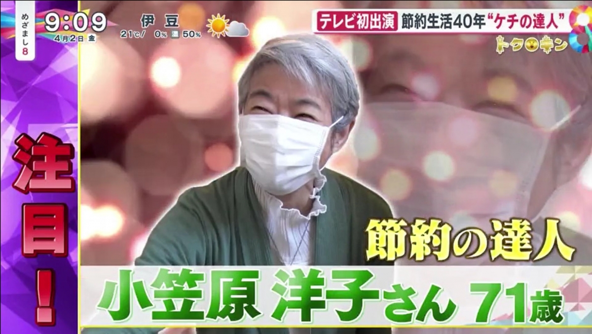 自從疫情爆發以來,許多人為了生計絞盡腦汁開源節流,但求儲多一點錢傍身。可惜香港物價居高不下,莫講話儲錢,就連開飯都成問題。而日本有位慳錢達人,竟然在過去40年來堅持每日只花1000日圓(約$70港元),相等於每月只用港幣2000元就能應付基本生活開銷。最近這位71歲的日本婆婆小笠原洋子在當地節目《めざまし8》中大方分享10個慳錢大法,日本同香港一樣物價高企,只要效仿婆婆的慳錢方式每日只花$70元並非無可能!
