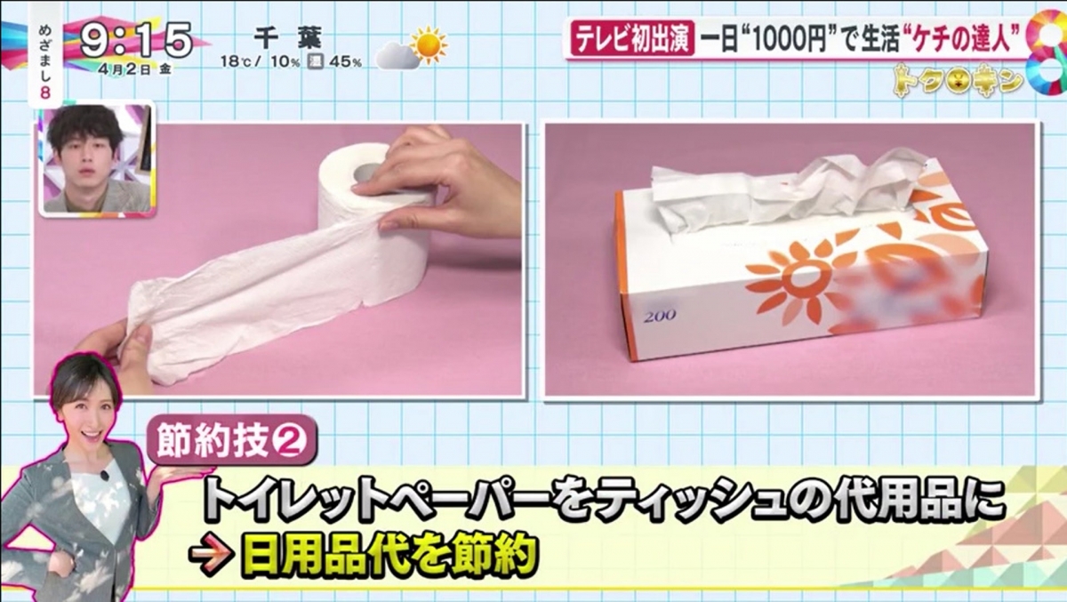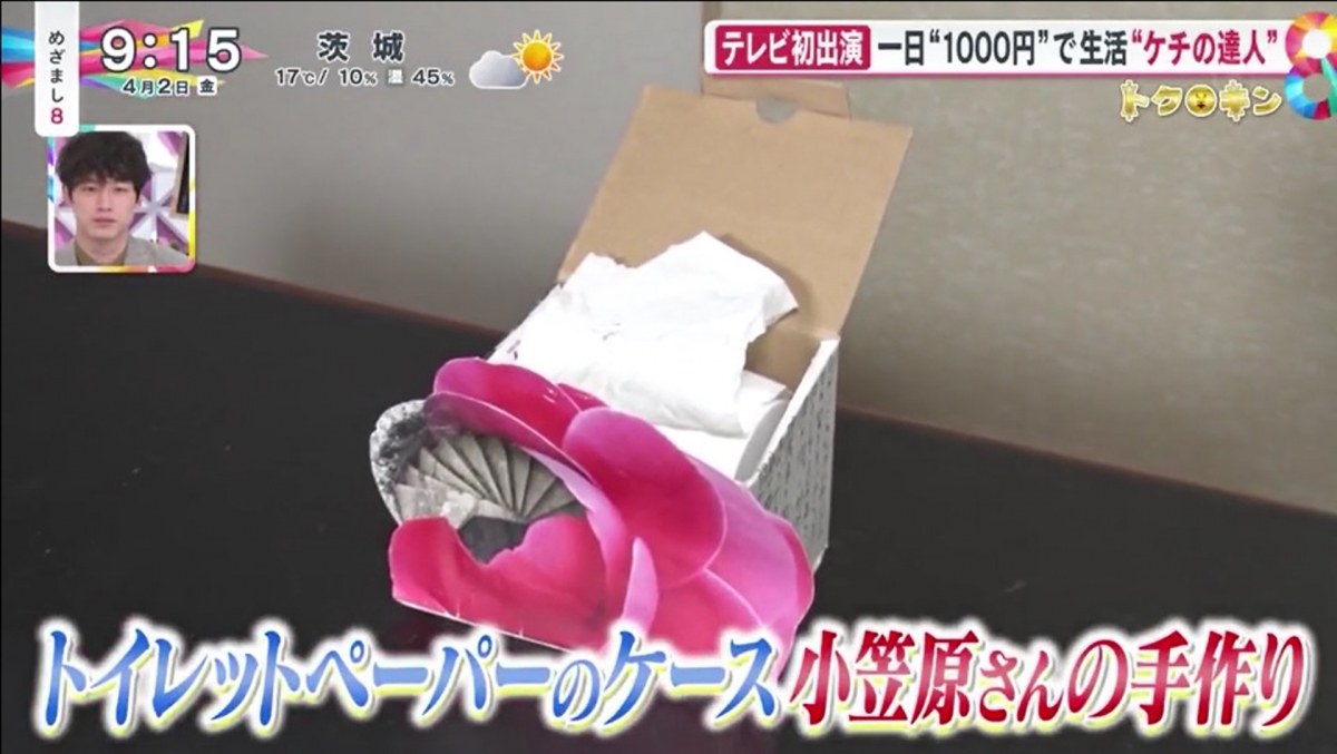 相比起盒裝紙巾,小笠原洋子認為卷裝廁紙更加經濟實惠,因為一格一格能夠精準的控制用量,只需將卷裝衛生紙放入自製的專用紙巾盒,就和取代盒裝紙巾。