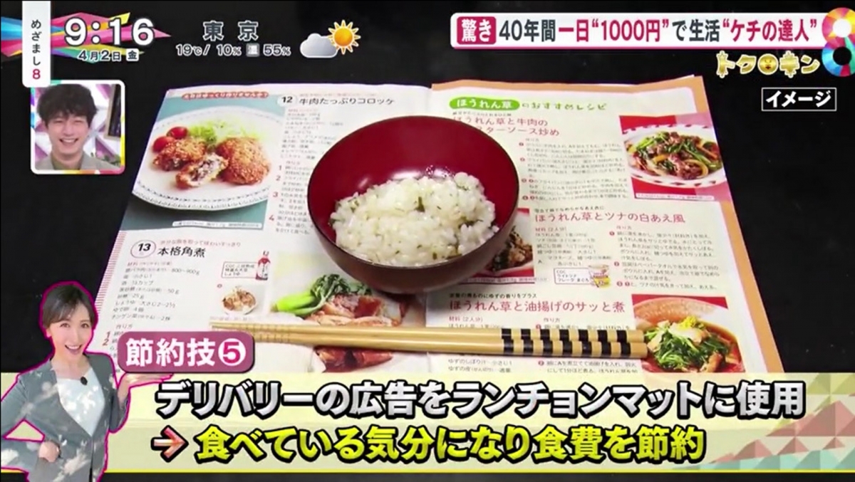 一般上傳單的材質較為厚實,所以小笠原洋子會將它們儲起,每次吃飯就當作枱墊使用,可省下抹枱和買桌墊的費用。