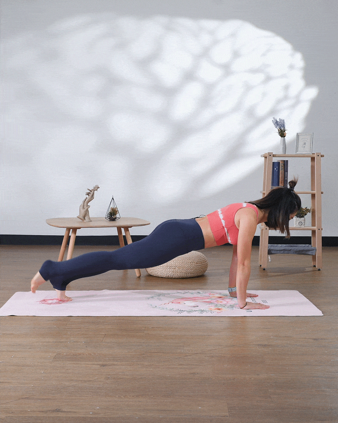 慢慢向前爬,做一個跪姿作準備,將雙腳伸直到一個高平板的位置,收腹,保持背部如一塊平板,將一隻腳慢慢升高,離開地面與盤骨一樣高度,然後下回地面,升高,做6-8下。在我們每次升高的時候,要保持背部穩定,大腿升高至盆骨位就足夠,同樣,做完一隻腳,下來休息一會,再做另一隻腳。