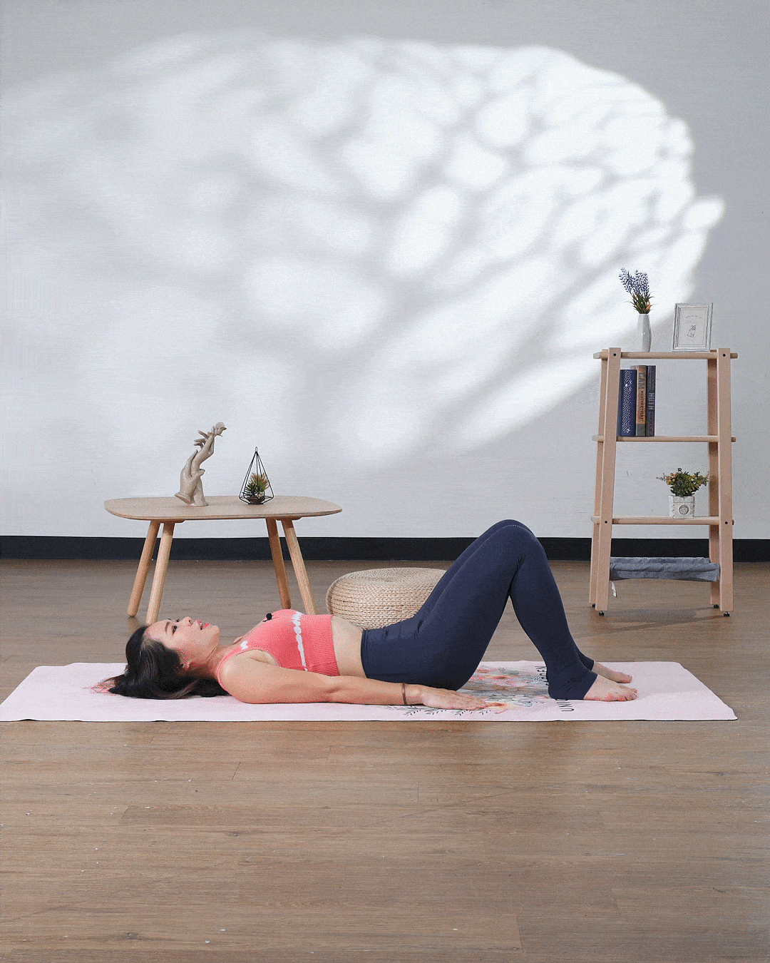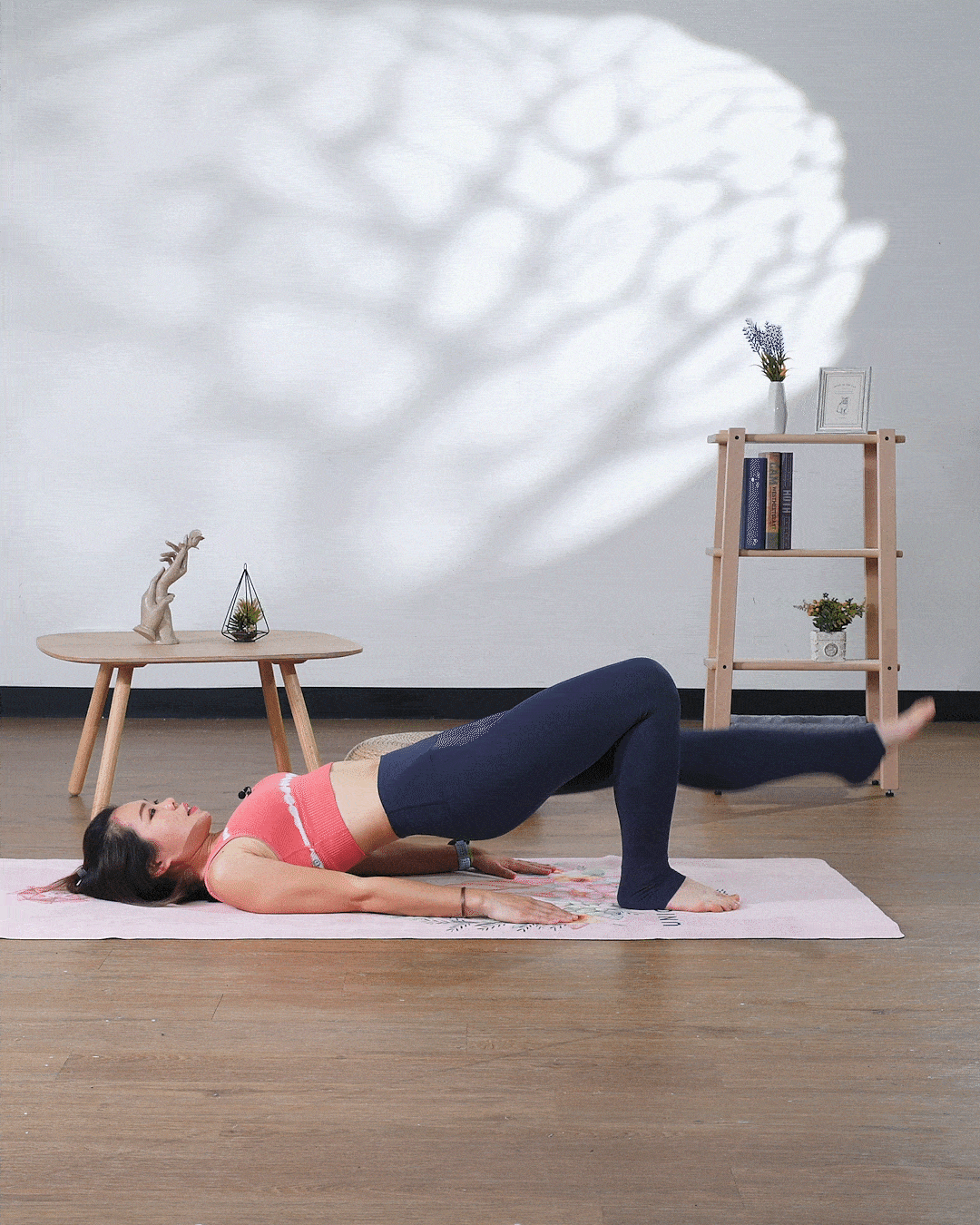 慢慢將整個人躺在地上,雙腳放在膝蓋垂直的位置,雙手放鬆在地上,肩膊沉低,吸氣,肚臍向內收,慢慢將盆骨升高,直至膝蓋、腹部和肩膊呈一條線,就在這個位置吸氣,呼氣慢慢蜷下,由背部、腰椎和臀部,慢慢返回地面,做6-8下。僅記在每一次上來的時候,都要感受盆骨夾緊。