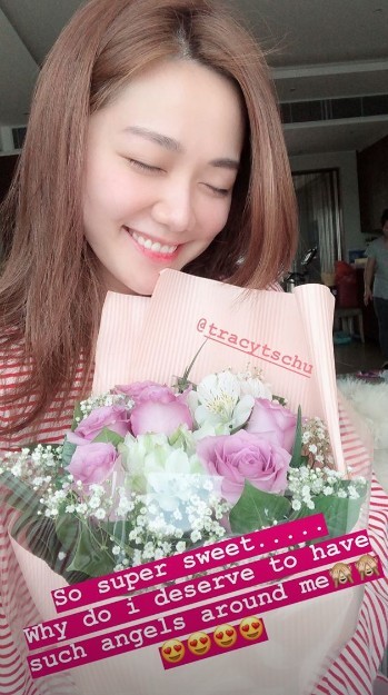靚湯喺Instagram張貼Story,內容係蔡思貝喺朝早6點鐘,就揸住一大紮玫瑰花企喺佢屋企門口俾驚喜佢,靚湯表示自己「好那」感動:「This is not normal touching this is ho la touching omg!」