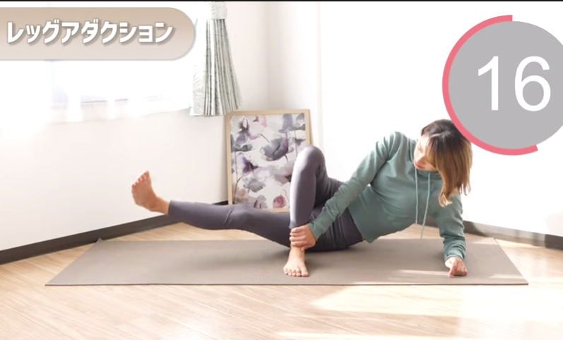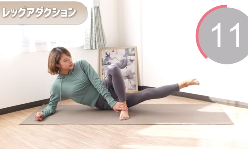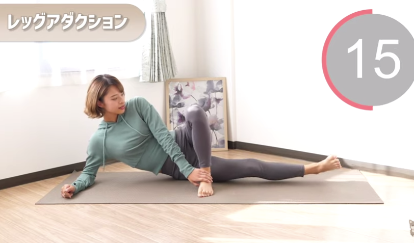 側躺在瑜珈墊上,左手撐地,左腿屈曲於右腳前,然後用右手捉緊左腳以穩定身體,右腿在下方,抬腿做20下,然後換另一邊重複動作。左右邊為一組,建議做3組。