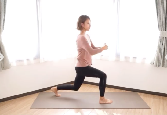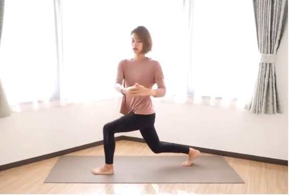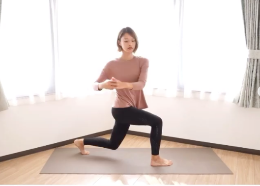 打開雙腳做預備動作,然後右腳踏前呈弓箭步,身體隨著動作向前傾,接著雙手合十放胸前,並向右轉,回到前方,這個動作做20下,然後換另一邊,左右邊為一組,建議做3組。