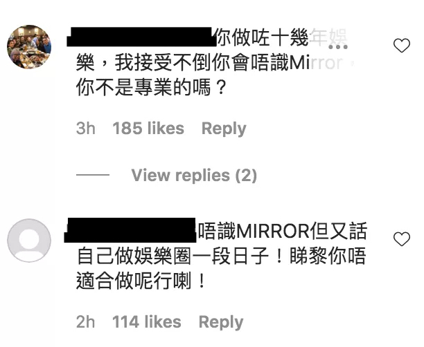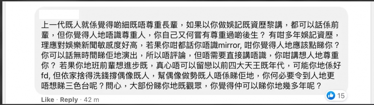 這篇千字文發出之後有網民力撐「每一個演出都要付出好多嘅時間及努力,就算喜歡或不喜歡都必須要尊重別人」,不過亦有網友指:「Mirror你都唔識」、「你太out」、「唔識MIRROR但又話自己做娛樂圈一段日子!睇黎你唔適合做呢行喇!」等。