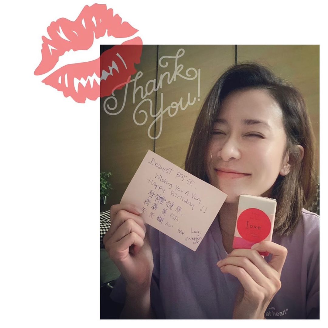 阿佘在照片中手持賀咭及禮物開心得咪起雙眼,她留言指︰「今天化成一個小fan,收到我偶像張曼玉送畀我嘅生日禮物,同親筆簽名生日咭(啲字實在太靚、太可愛)無比開心和興奮!親手做嘅環保肥皂和環保蠟燭,讓海洋裏的小蝦小魚吃了後也身體健康,太有愛了!」阿佘還hashtag「#癲咗 #開心到瞓唔着 #太幸福了」,從文字中亦感受到她心情相當興奮,開心程度猶如追星少女呢!