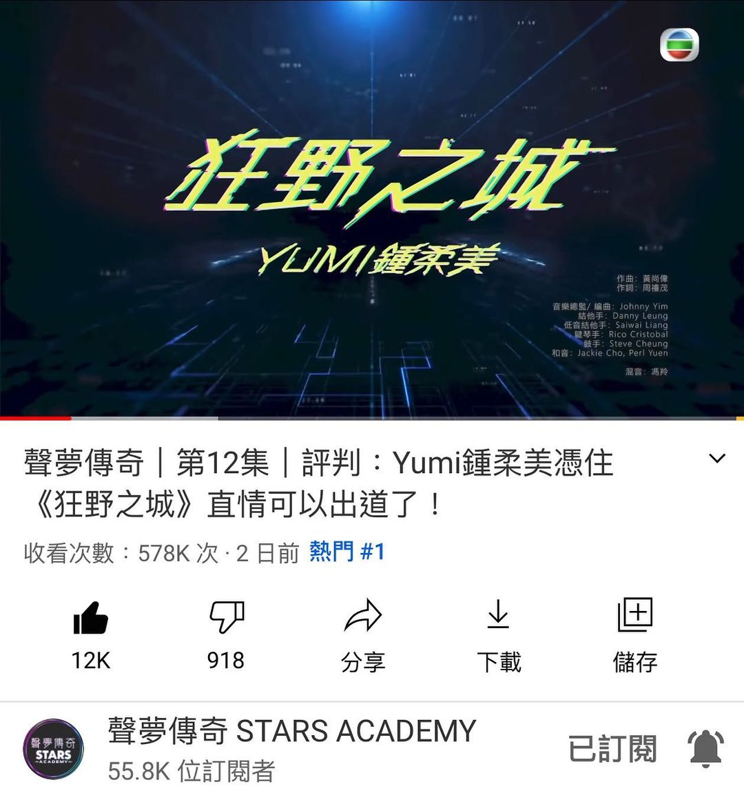 TVB歌唱比賽節目《聲夢傳奇》近期成為熱話,炎明熹GiGi及姚焯菲Chantel分別憑《沒有你還是愛你》及《戀愛預告》先後彈出,最近一集,具跳舞天份的鍾柔美Yumi亦在比賽中一鳴驚人,跳唱郭富城的《狂野之城》,獲得評判一致稱讚,短片上載到YouTube後,迅即成為熱爆影片第1位,更獲評判大讚高質,可以直接出道!