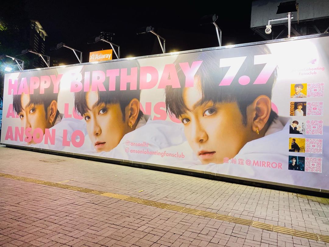 為慶祝教主生日,神徒斥資10萬元,租下尖沙嘴五支旗桿附近的巨型廣告位,讓粉絲瘋狂打卡,該巨型廣告位在天星碼頭當眼位置,相當搶眼,廣告上寫上「HAPPY BIRTHDAY 7.7 ANSON LO」的字樣,一邊印有Anson Lo曾推出過的歌曲二維碼,讓大家更了解教主,另一邊則印上參與今次應援的神徒名單,相當有愛!