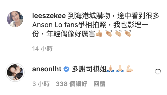 這個巨型廣告牌威力強大,上周粉絲聚集不但驚動警方到場了解,就連李司棋路過都要打卡!李司棋昨日亦有到尖沙咀的巨型廣告牌與教主合照,她在IG寫上:「到海港城購物,途中看到很多Anson Lo fans爭相拍照,我也影埋一份,年輕偶像好厲害。」,Anson Lo亦有現身IG親自感謝司棋姐的支持,非常有禮!