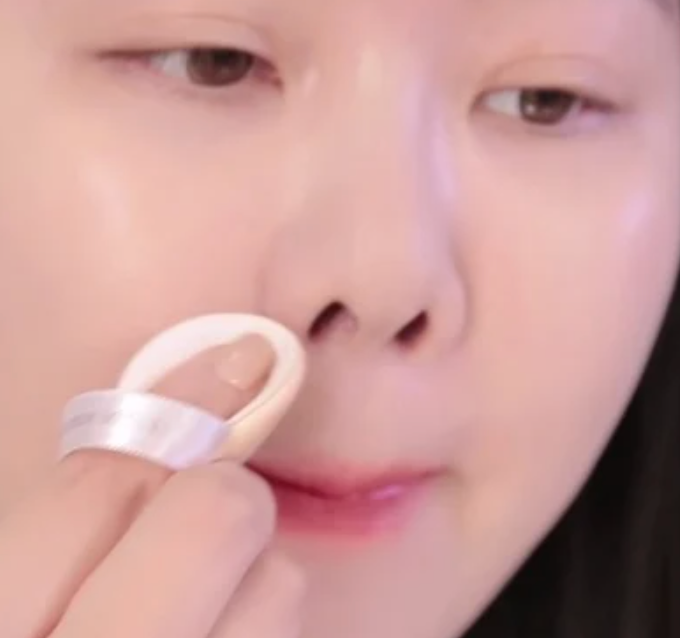 在毛孔粗大的位置,可以用中指以彈壓的方法來填補毛孔,只需一至兩下就將有毛孔位置隱形,而且看起來一點也不會厚粉。另外,在容易泛紅及暗沉的地方,我們也可以用同樣方法來上粉,這樣能更細緻地遮蓋瑕疵。