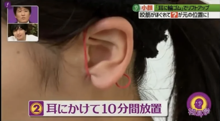 日本就有專家指出只需要一條橡筋及10分鐘的時間,便可以緊緻面部肌肉!將大小適中的橡筋套在耳上,大約10分鐘後除下便可見兩邊面額明顯變瘦。專家解釋橡筋套住耳朵可以放鬆嘴嚼肌,同時可以令原本移位的面⻣返回正確的位置,不過這種方法不建議每天進行,大家可在重要場合作為臨時瘦面方法好了!