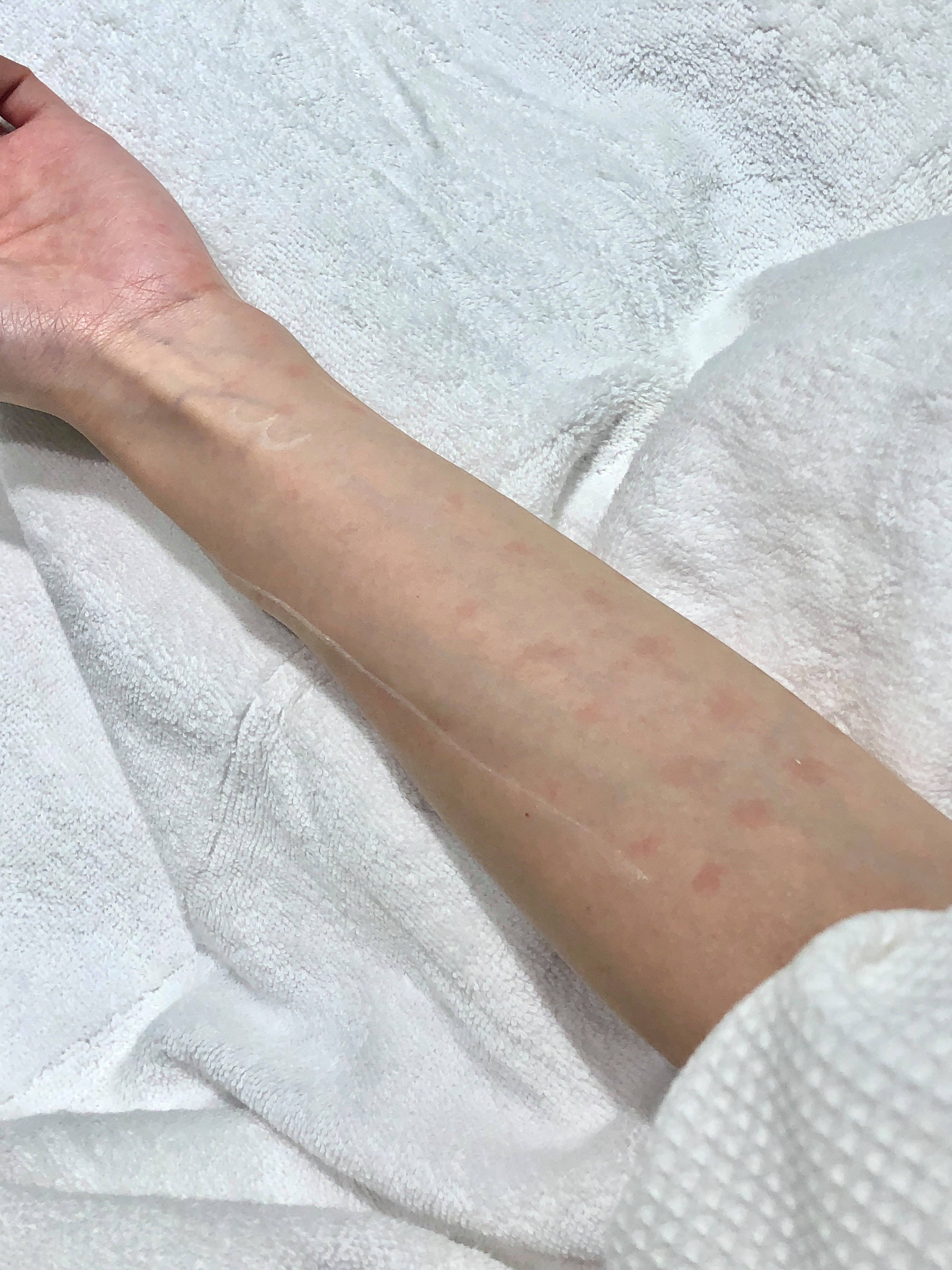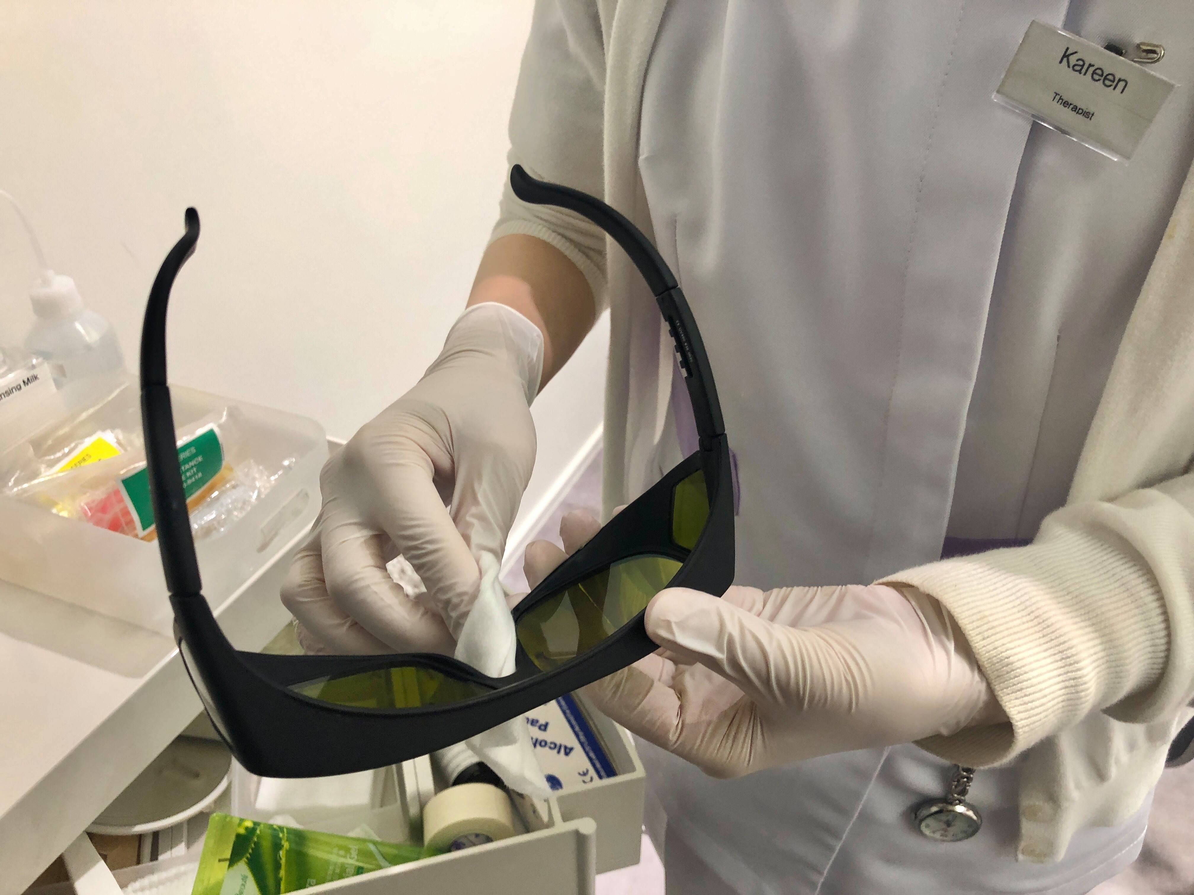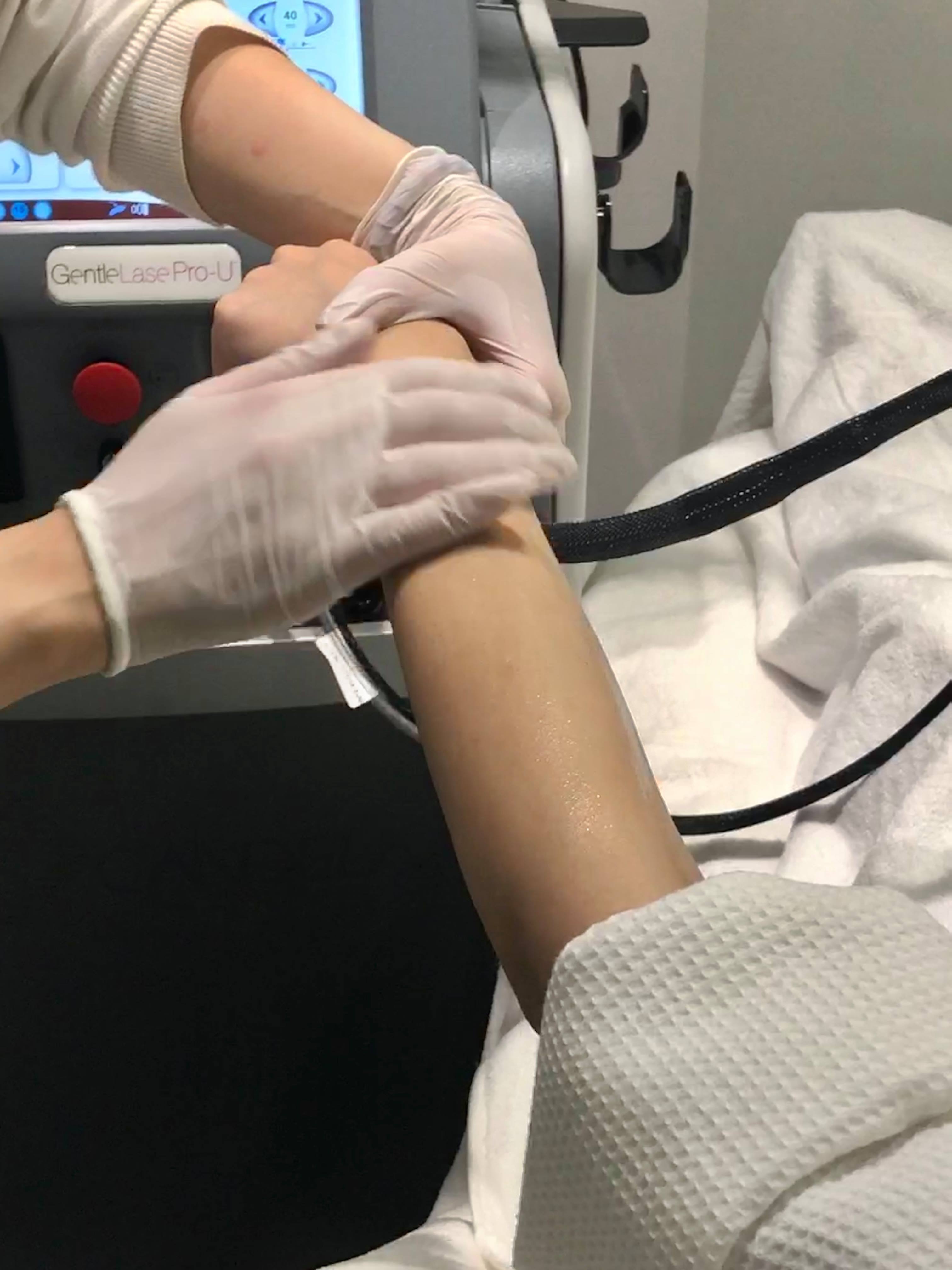 開始前治療師超貼心為我提供激光專用眼鏡,確保療程時激光不會傷害到雙眼,並在手臂位置細心的畫上分區後就開始,因為脫毛機配備「智能降溫系統」在發射激光前毫秒間噴射-20度的霧態冷凍劑,為皮膚做到鎮靜及急速冷凍的效果,所以美編在整個過程中絲毫沒有任何痛楚感,只會感到如少許冰水噴在肌膚的感覺,整個過程不到30分鐘就完成!當中治療師也不會硬銷療程,令美編可以在零壓力下完成脫毛療程,值得一讚!