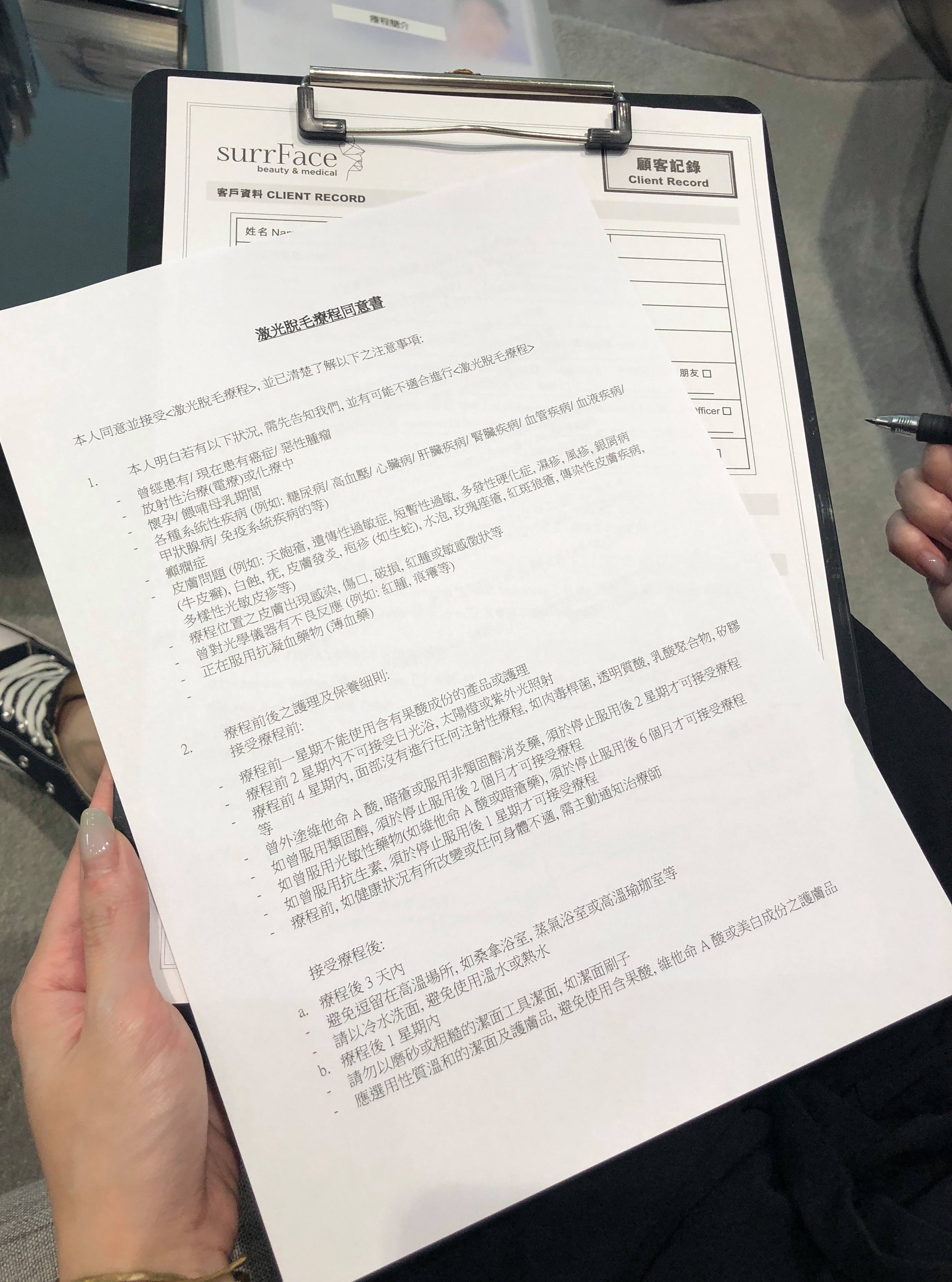 每次做任何療程的時候其實我們都需要了解當下肌膚的狀態,脫毛也不例外!美編到達SurrFACE後,除了填寫基本資料外,治療師亦會分析美編的毛髮生長情況,她更向美編表示如果長期只靠剃刀的話,毛髮很易出現倒生,更會令肌膚漸漸變得粗糙如「雞皮」,所以激光脫毛是最一勞永逸的方法!